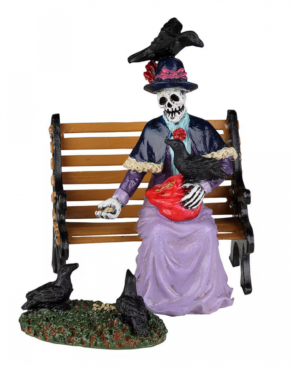 Feeding the Birds – Lemax Spooky Town Figur Alte Skelett Oma, auf einer Parkbank sitzend, die in der Halloween Town schwarze Raben füttert Die schwarzen Raben der Spooky Town wissen genau, woher sie ihr Fütter bekommen. Von der alten Lady auf der Bank! Vier, schwarze Vögel sitzen auf ihrem Hut, auf dem Boden unter ihrem langen Rock und sogar auf ihrem Schoß. Die Feeding the Birds – Lemax Spooky Town Figur wird eine Sehenswürdigkeit im Park von Spooky Town. Die wunderbar, gestaltete Feeding the Birds – Lemax Spooky Town Figur einer alten Skelett-Dame, die auf der Parkbank sitzt, lässt sich von allen Seiten her betrachten und ist detailverliebt von Hand bemalt. Bestelle dir jetzt die Spooky Town Vogel Oma und gestalte damit dein eigenes Gruseldorf. Die Spooky Town Figur verfügt nicht über Licht, Bewegung oder Sound. Lieferumfang: 1 x Feeding the Birds – Lemax Spooky Town Figur Farbe: Violett, Schwarz, Braun, Rot Größe: ca. 8 x 6,5 x 5 cm Material: Polyresin (Kunststein) Dekorative Figur aus der Spooky Town Kollektion Ohne Beleuchtung, ohne Bewegung und Sound