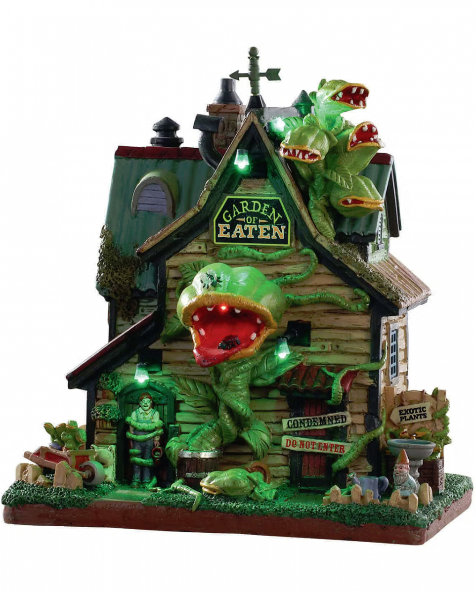 Garden of Eaten Nursery – Lemax Spooky Town Horror Gewächshaus mit fleischfressender Pflanze Dieses Gewächshaus ist ein gefährlicher Ort, wie die Warnschilder unschwer erkennen lassen. Unser Garden of Eaten Nursery von Lemax Spooky Town wird von gierigen Pflanzen bewohnt, die es auf Frischfleisch abgesehen haben… Das Garden of Eaten Nursery – Lemax Spooky Town ist eine beleuchtete Horror Figur zum Sammeln. Die Szenerie zeigt ein Gewächshaus mit fiesen Schlingpflanzen, Gartenzwergen und Warnschildern. Der Artikel ist handbemalt und wird mit einem Adapter geliefert. Lieferumfang: 1 x Lemax Spooky Town – Garten der fleischfressenden Pflanzen Inhalt: 1x Gebäude, 1x 4,5V Netzteil Farbe: Grün, Rot, Beige, Braun, Schwarz Größe: ca. 21,9 x 19,5 x 13,4 cm Gewicht: 1140 g Stromversorgung: Adapter wird mitgeliefert Material: Polyresin (Kunststein), Elektronik Spooky Town Gartenhaus Horror Geschenkidee mit fleischfressenden Pflanzen Beleuchtetes Gartenhaus Schild mit Licht in der Dachgabel des Hauses Adapter im Lieferumfang enthalten Der Artikel ist ein Dekoartikel. Von Feuer und offenen Flammen fernhalten.