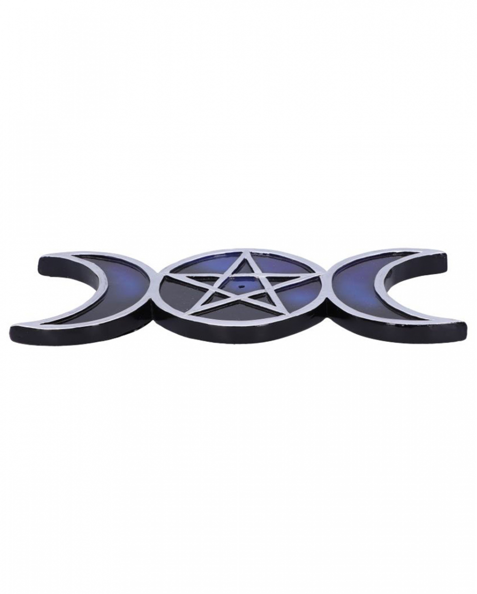 Lunar Trinity Räucherstäbchen Halter 21,5cm Dekorativer Dreifach Mond mit Pentagramm als Halter für Rauchwerk Unser Räucherstäbchen Halter in Form des dreifachen Mondsymbols liegt auf jeder ebenen Fläche und besteht aus den silbernen Umrissen des zunehmenden, vollen und abnehmenden Mondes. Im Inneren des Vollmonds befindet sich ein Pentagramm mit einem zentralen Loch, in das du dein Lieblings-Räucherstäbchen stecken kannst. Der Lunar Trinity Räucherstäbchen Halter stellt den Zyklus des Lebens dar und wurde aus feinstem Polyresin gegossen und anschließend sorgfältig von Hand bemalt. Wunderbar als Tischdekoration für deine Gruft und als Geschenk für Liebhaber des okkulten. Lieferumfang: 1 x Lunar Trinity Räucherstäbchen Halter 21,5cm Farbe: Schwarz, Violett, Silber Größe: ca. 21,5 cm Material: Polyresin (Kunststein) Okkulter Räucherstäbchenhalter mit Dreifach Mond Symbol Mit Loch in der Mitte als Halterung für Räucherstäbchen
