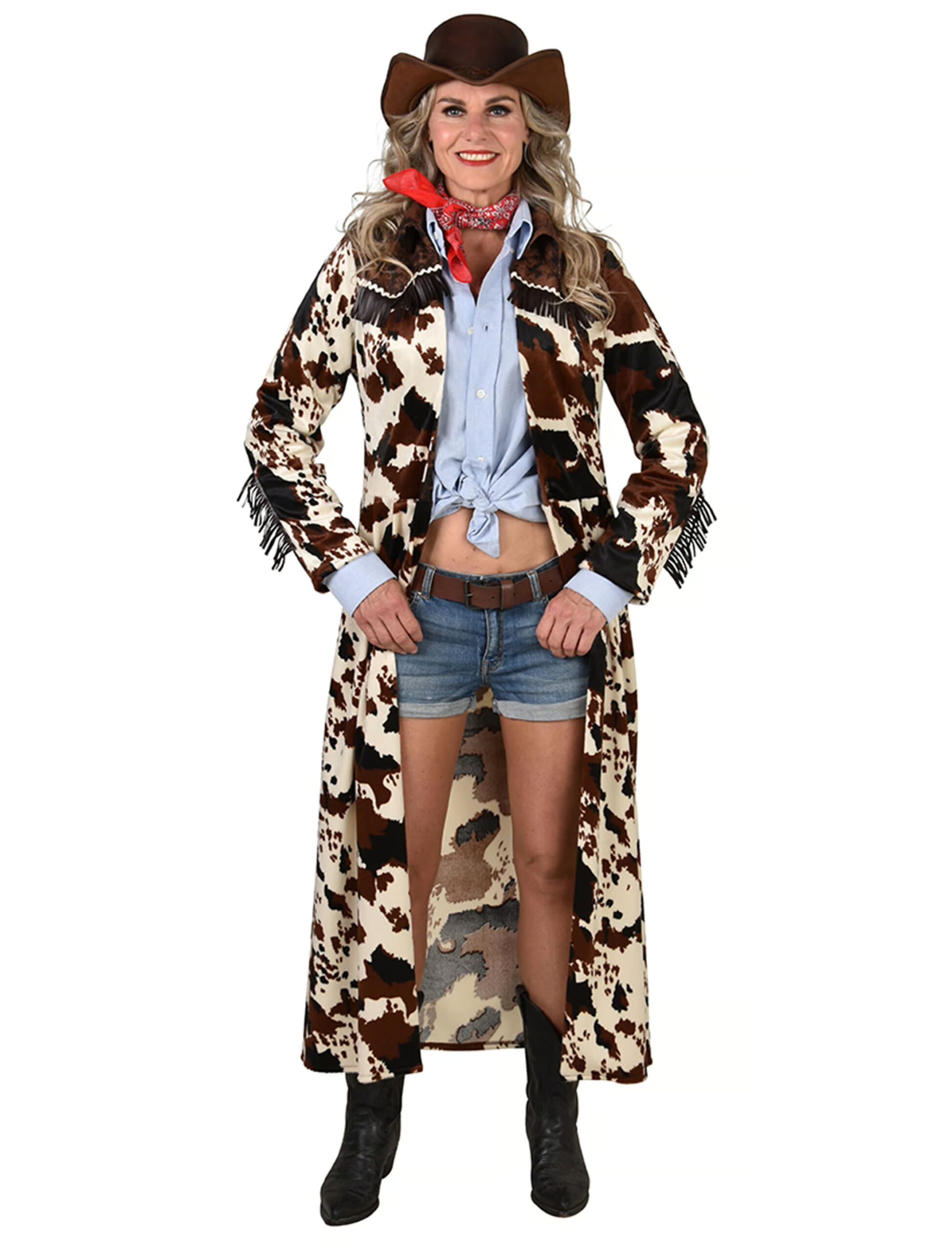 Mantel Cowboy Kuhmuster lang Damen beige/braun S/M, ideal für Karneval & Fasching