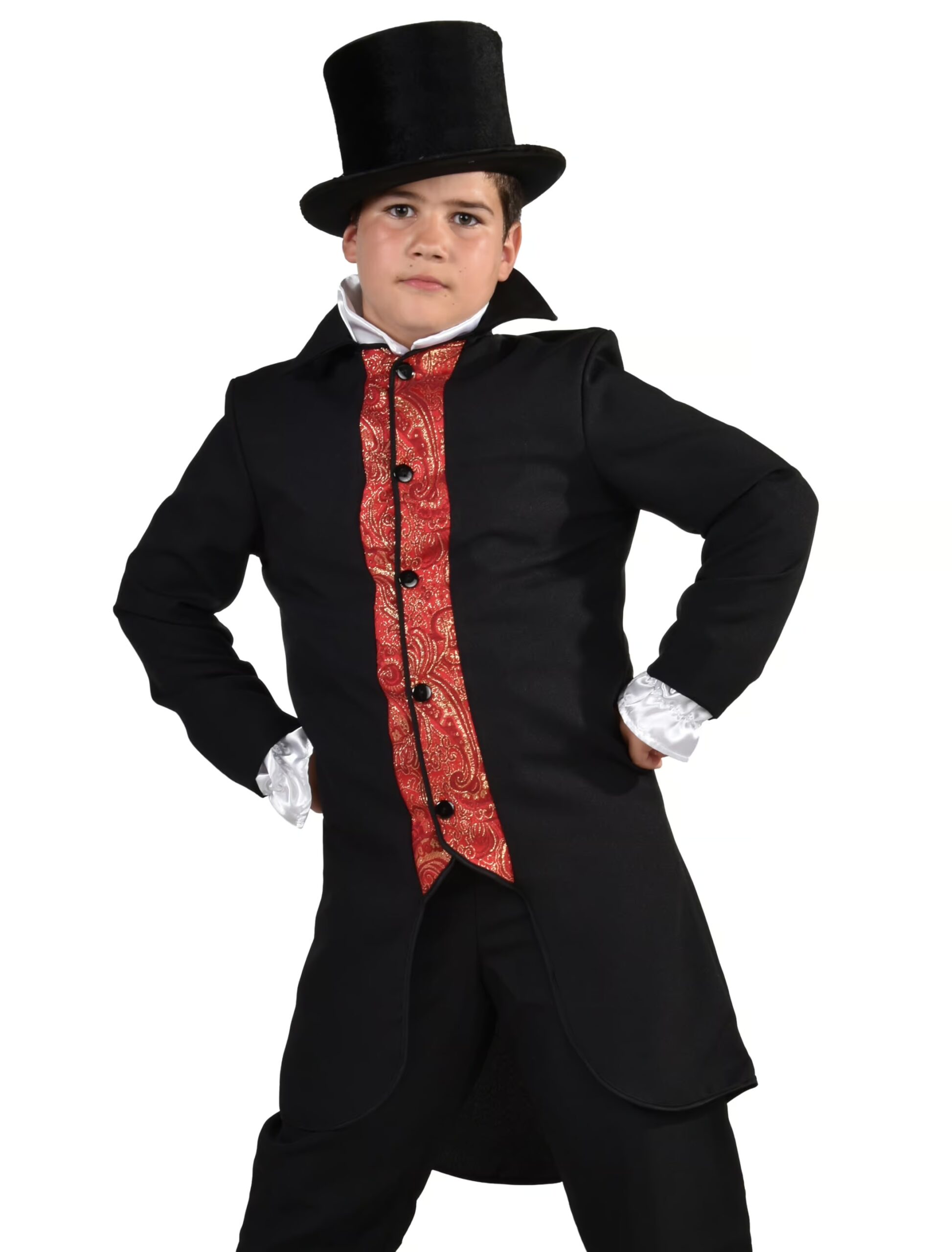 Der elegante schwarze Kindermantel aus Polyester mit der integrierten rot-goldenen Weste zum Knöpfen und dem spitzen Kragen bietet viel Spielraum für kreative und individuelle Verkleidungsmöglichkeiten, die Deinem Kind bestimmt viel Spaß machen. Es kann als berühmter Zauberer sein Publikum auf der Geburtstagsfeier oder dem Schulfest mit kleinen Zaubertricks in seinen Bann ziehen. Oder es wird zum weltbekannten Zirkusdirektor, der mit seiner gefährlichen Plüschtiger- und Kuschellöwennummer den Atem der Zuschauer zum Stocken bringt. Mit dem Kindermantel und einem Zylinder sowie weißen Handschuhen aus unserem Shop ist Dein Kind bestens für Kostümfeste, Fasching, Halloween, und Mottopartys ausgestattet.