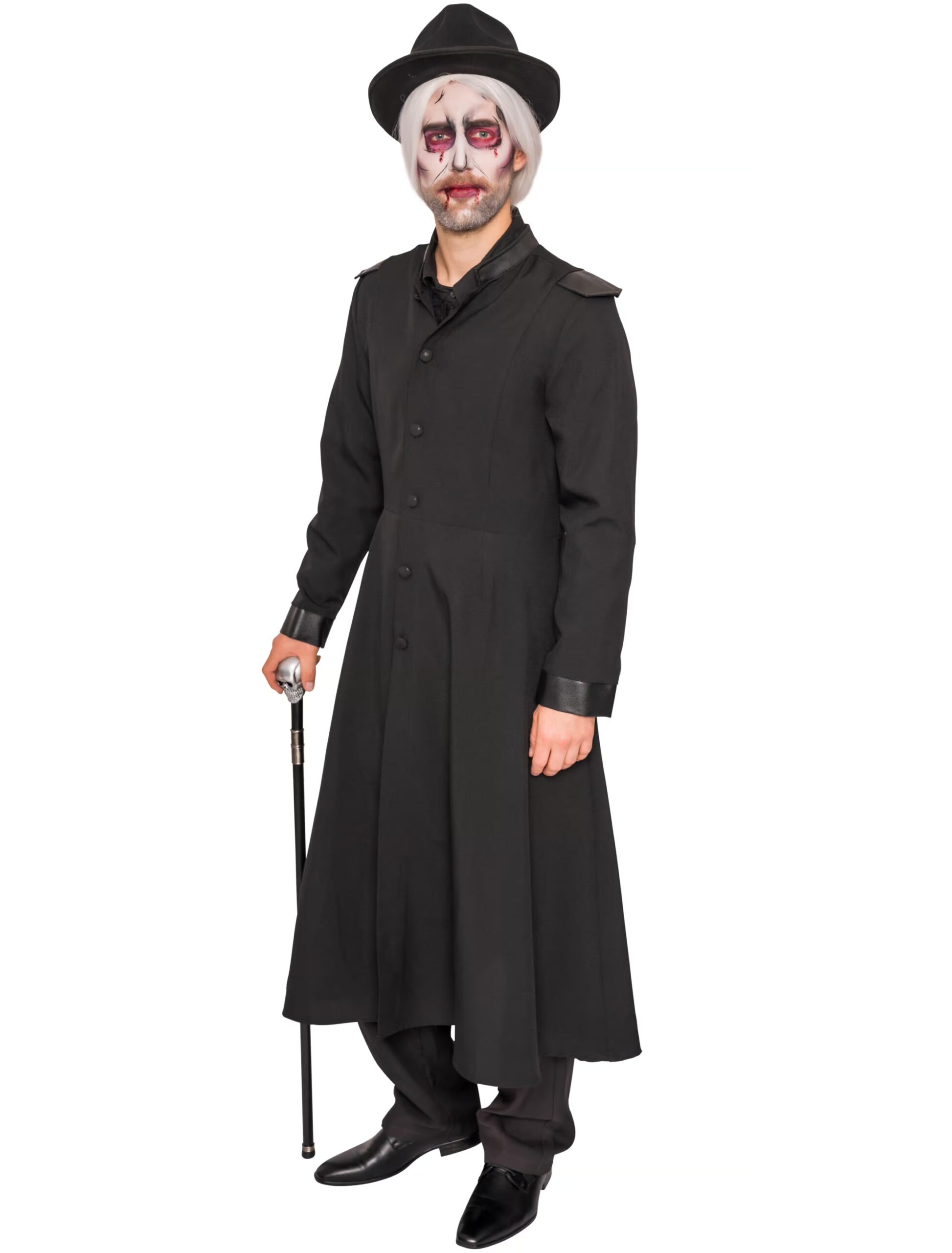 Nicht nur den Damen steht ein Hexenmantel, sondern auch die Herren punkten mit diesem schwarzen, wadenlangen Mantel mit Kunstleder-Applikationen und dekorativer Knopfleiste. Mit an der Taille angesetzten Falten ist dieser Hexenmantel besonders bequem. Vervollständigt wird dieser abenteuerliche Grufti-Look mit Hut und grauer Perücke, die wir separat für Dich in unserem Shop bereithalten. Nun musst Du Deinen kreativen Look nur noch mit hochwertiger Faschingschminke aufpeppen. Aufwendige Gesichtsmalerei und Grufti Outfit lassen Dich an Halloween und Karneval zum wahren Hexenmeister werden.