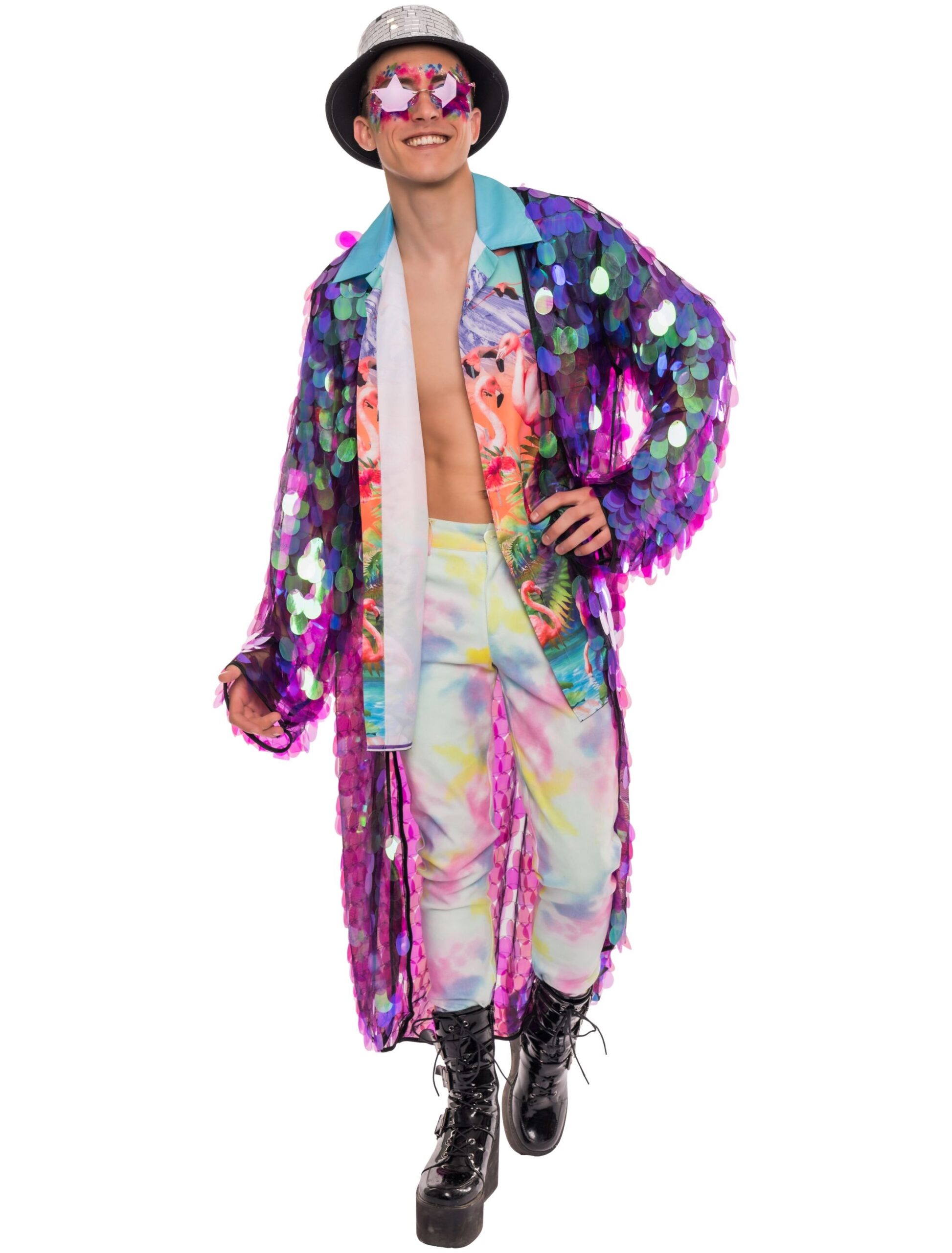 Mit unserem langen Pailletten Mantel wirst du selbst zur funkelnden Attraktion – glamourös, auffällig und absolut partybereit. Der durchlässige Mantel ist von oben bis unten mit großen, schimmernden Pailletten bedeckt, die bei jeder Bewegung spektakulär im Licht glitzern. Das macht ihn zum perfekten Begleiter für Karneval, Festivals oder wilde Partynächte. Egal ob über einem Kostüm, einem schlichten Outfit oder als Statement-Piece: Mit unserem Pailletten Mantel sorgst du garantiert für strahlende Auftritte!