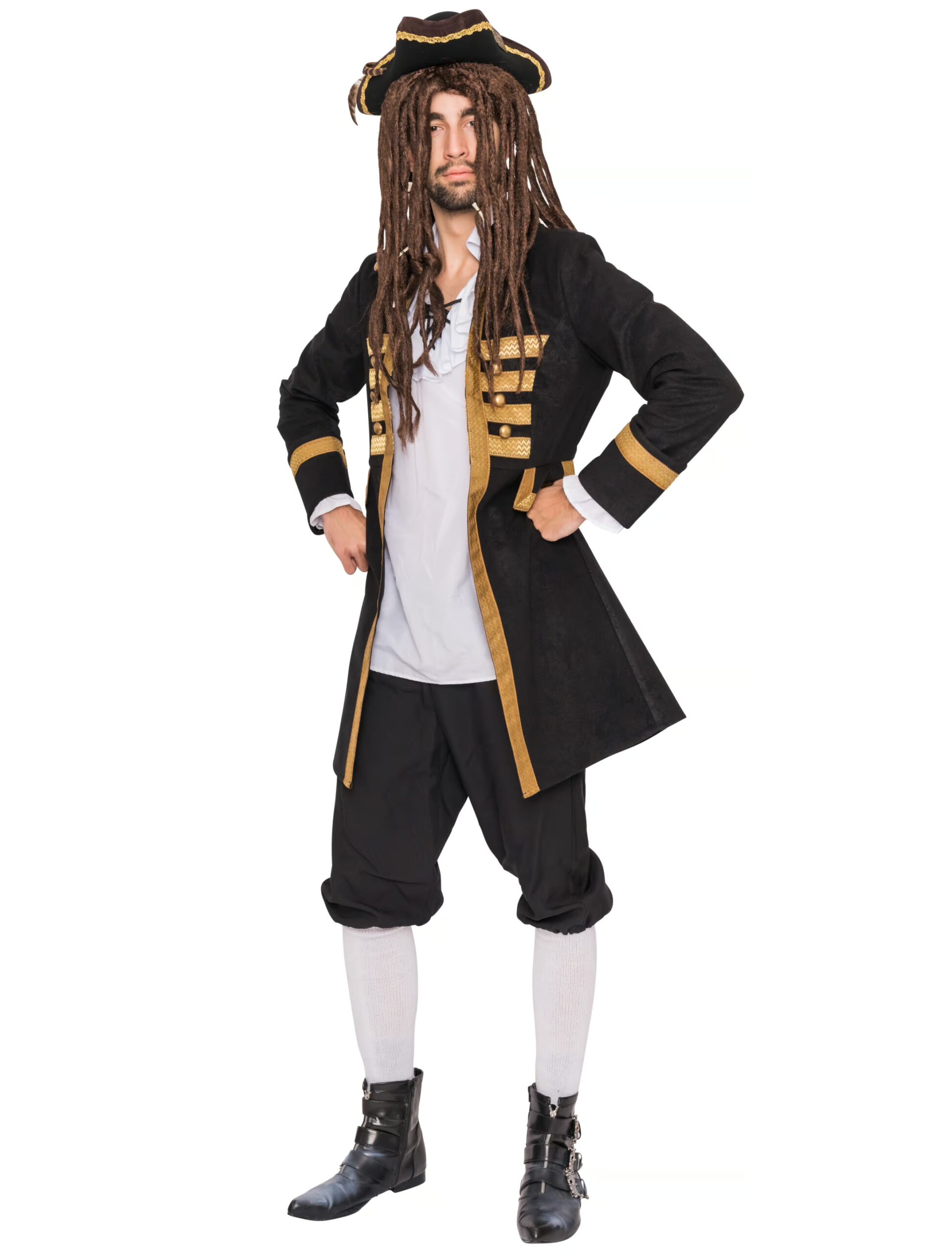 Sehr schick und elegant ist dieser schwarz-goldene Piratenmantel für den anspruchsvollen Herren, in dem Du zum unwiderstehlichen Blickfang wirst, der durch seine eindrucksvolle Erscheinung die Damenwelt verzaubert. In diesem oberschenkellangen, figurnah geschnittenen Mantel mit dem schmalen Kragen, den goldenen Riegeln und Knöpfen sowie den passenden und schicken Accessoires aus unserem Shop bist Du nicht nur der Beherrscher der Weltmeere, sondern auch ein gern gesehener Gast auf jeder Motto- und Karnevalsparty.