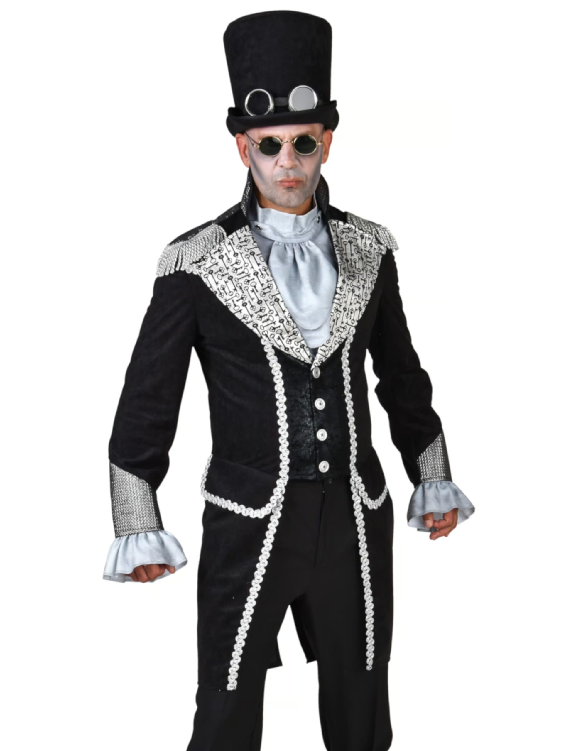 Krasser Mantel aus der Steampunk Ära in Schwarz mit silbernem Design und vielen Applikationen. Damit schießt Du auf jeder Party zu Halloween, Karneval, Fasching oder Silvester den absoluten Vogel ab. Der knielange Mantel ist aus 100% Polyester gefertigt, was ihn unempfindlich und sehr angenehm zu tragen macht. Er ist leicht zu reinigen und schnell wieder einsatzbereit. Die Nähte sind mit aufwändig gearbeiteten silbernen Bordüren abgesetzt, der Stehkragen sorgt für ein elegantes Erscheinungsbild.