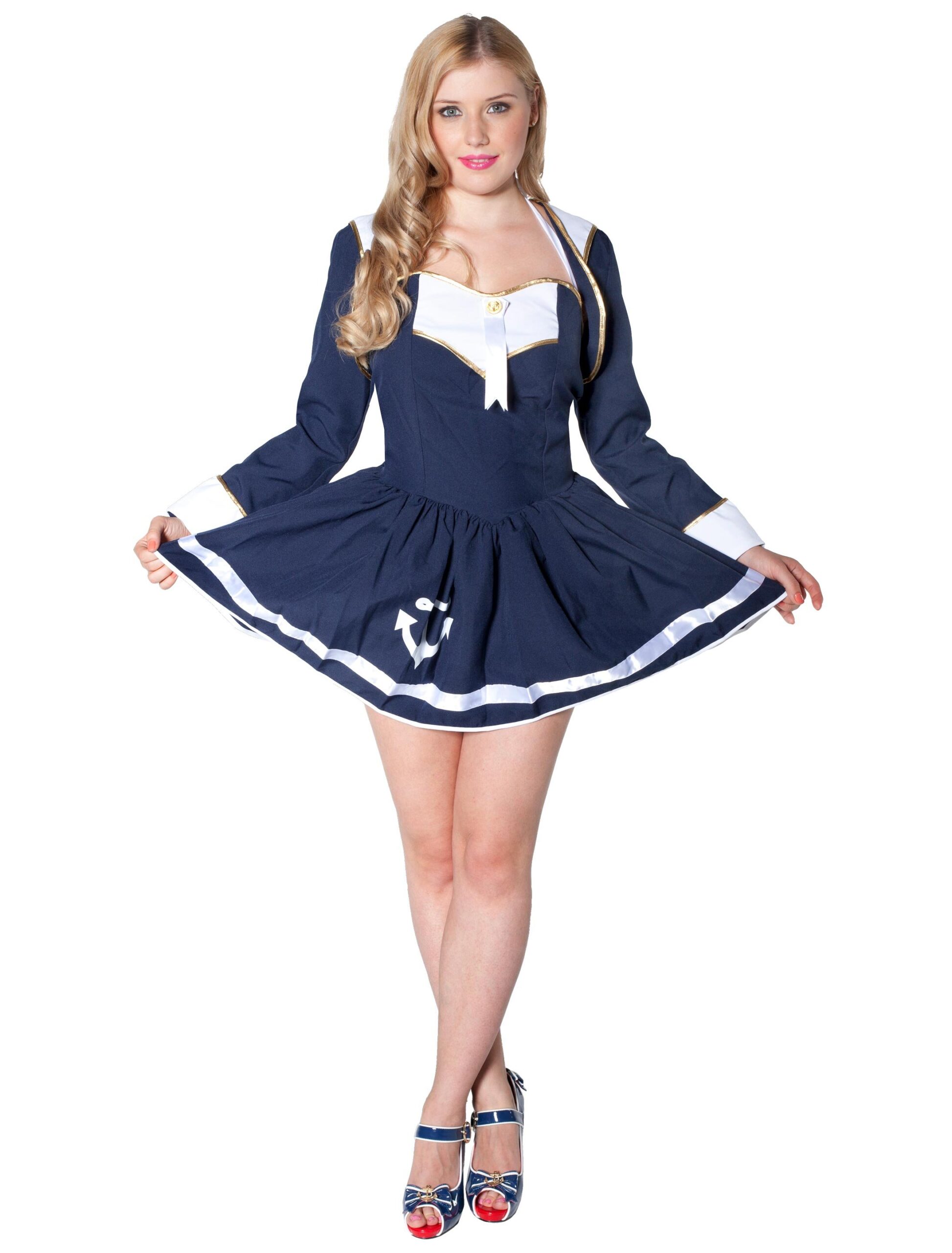 Raue Luft, starker Wellengang, viel Arbeit und kurze Nächte? Wie wäre es stattdessen mit schunkelnden Narren, toller Musik, ausgiebiger Stimmung und langen Nächten, die Du nicht mehr vergisst? Klingt das nach einem Deal? Dann schnapp´ Dir Dein Matrosin Kostüm! Dieses besteht aus einem hübschen Minikleid und einem Bolero-Jäckchen im angesagten Marine-Style. Der Kragen und die Ärmel der Jacke sowie der Dekolletee-Bereich des Kleids sind mit weißem Stoff abgesetzt und mit Goldborten verziert. Natürlich dürfen für Deinen perfekten, maritimen Auftritt keine Streifen und Anker fehlen. Diese sind auf der Rockfront aufgebügelt und fallen sofort auf. Der große, goldene Knopf im Dekolletee-Bereich und das Emblem am Jackenärmel runden das Matrosin Kostüm ab. Dieses Damenkostüm eignet sich nicht nur für jede Faschings- oder Mottoparty sondern auch für jeden Hafengeburtstag.