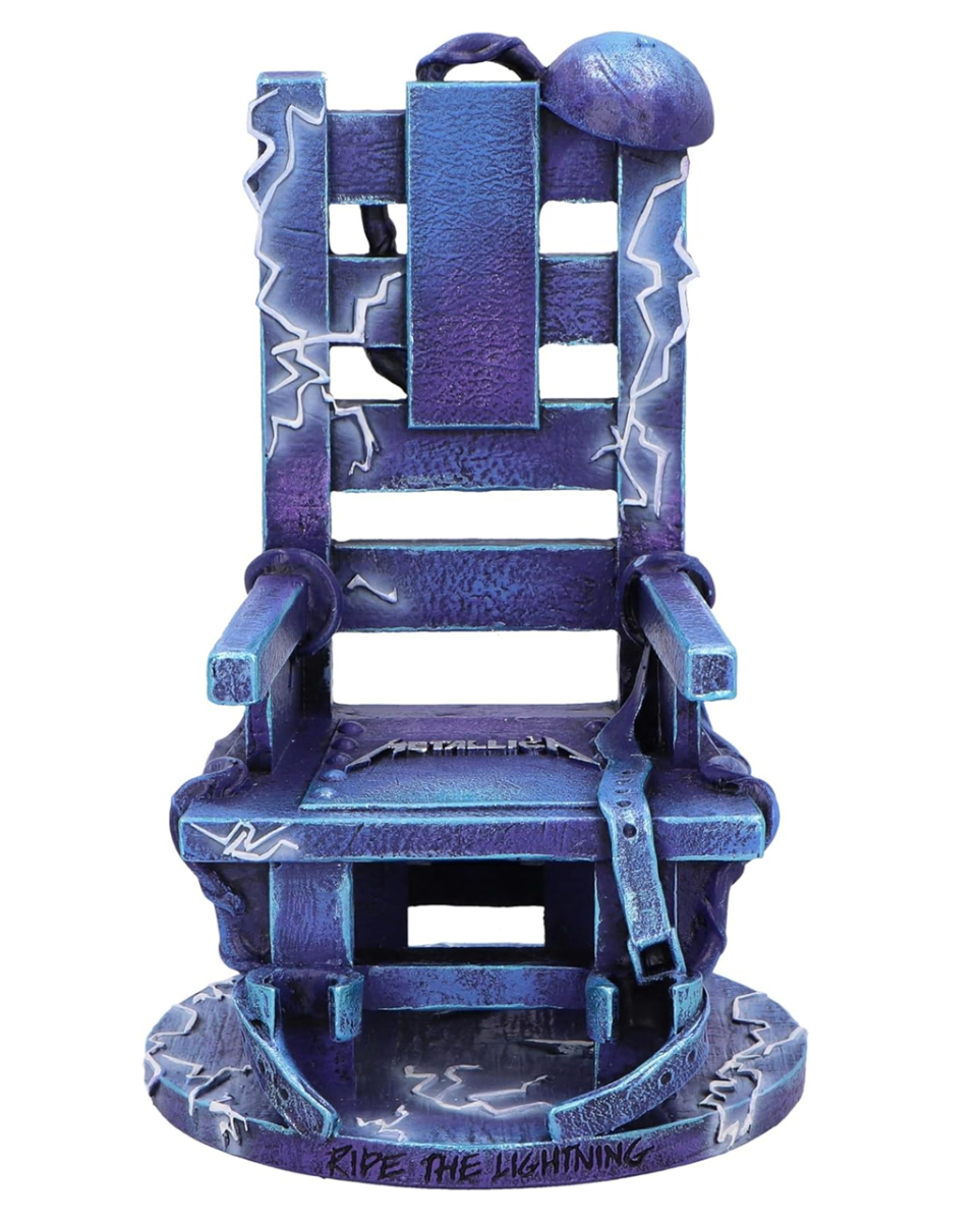 Metallica – Ride the Lightning Skulptur 15 cm Fan-Figur eines elektrischen Stuhls für Metallica Fans Der ikonische, elektrische Stuhl vom ",Ride The Lightning", Album-Cover der Band Metallica ist nun auch als Sammelfigur erhältlich. Sichere dir dieses Stück Musikgeschichte als Symbol deiner Fan-Liebe! Die ca. 15 cm große Metallica – Ride the Lightning Skulptura zeigt einen aus Kunststein gefertigten elektrischen Stuhl in Blau. Er wurde sorgfältig von Hand bemalt und ist von detaillierten weißen Stromblitzen umgeben. Lieferumfang: 1 x Metallica – Ride the Lightning Skulptur 15cm Farbe: Blau, Silber, Schwarz Größe: ca. 15 cm Material: Polyresin (Kunststein) Metallicas Ride the Lightning Elektrischer Stuhl mit Stromblitzen Inspiriert vom Albumcover Ride the Lightning Fan-Skulptur Geschenkidee für Heavy Metal Fans Verpackt in einer coolen Metallica Geschenkbox, die einen sicheren Transport garantiert Aus hochwertigem Polyresin gegossen und fachmännisch handbemalt