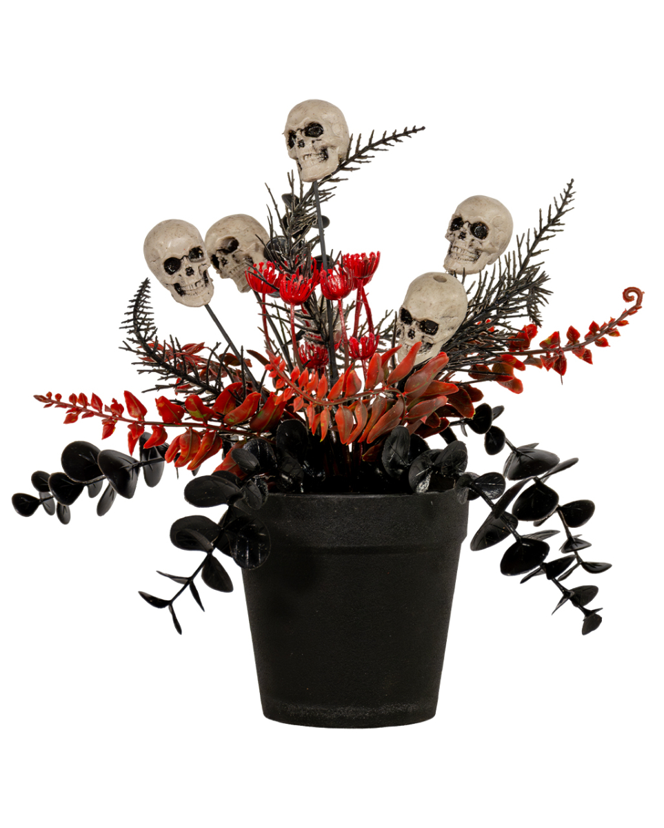 Schwarz-Rote Kunstpflanze mit Totenköpfen 23cm Halloween Homeware mit schwarz-roten Blüten Tiefrote Blüten und pechschwarze Blätter lassen diese Kunstpflanze zum Hingucker werden. Untermalt wird die düstere Ästhetik durch 5 kleine Totenköpfe. Unsere schwarz-rote Kunstpflanze mit Totenköpfen sorgt für einen echten Blickfang. Die Totenkopf Topfpflanze ist mit künstlichen Blüten und Blättern designt. Sie benötigt kein Licht oder Wasser und sieht das ganze Jahr über super aus. Lieferumfang: 1 x Schwarz-Rote Kunstpflanze mit Totenköpfen 23cm Farbe: Schwarz, Rot, Beige Größe: ca. 23 x 18 x 14 cm Material: Kunststoff Schwarz-rote Totenschädel Topfpflanze Künstliche Grusel-Pflanze mit Totenköpfen Halloween Deko-Pflanze im Topf Wunderschöne Gothic Zimmerpflanze fürs ganze Jahr Der obere Topfrand hat einen Durchmesser von ca. 9cm