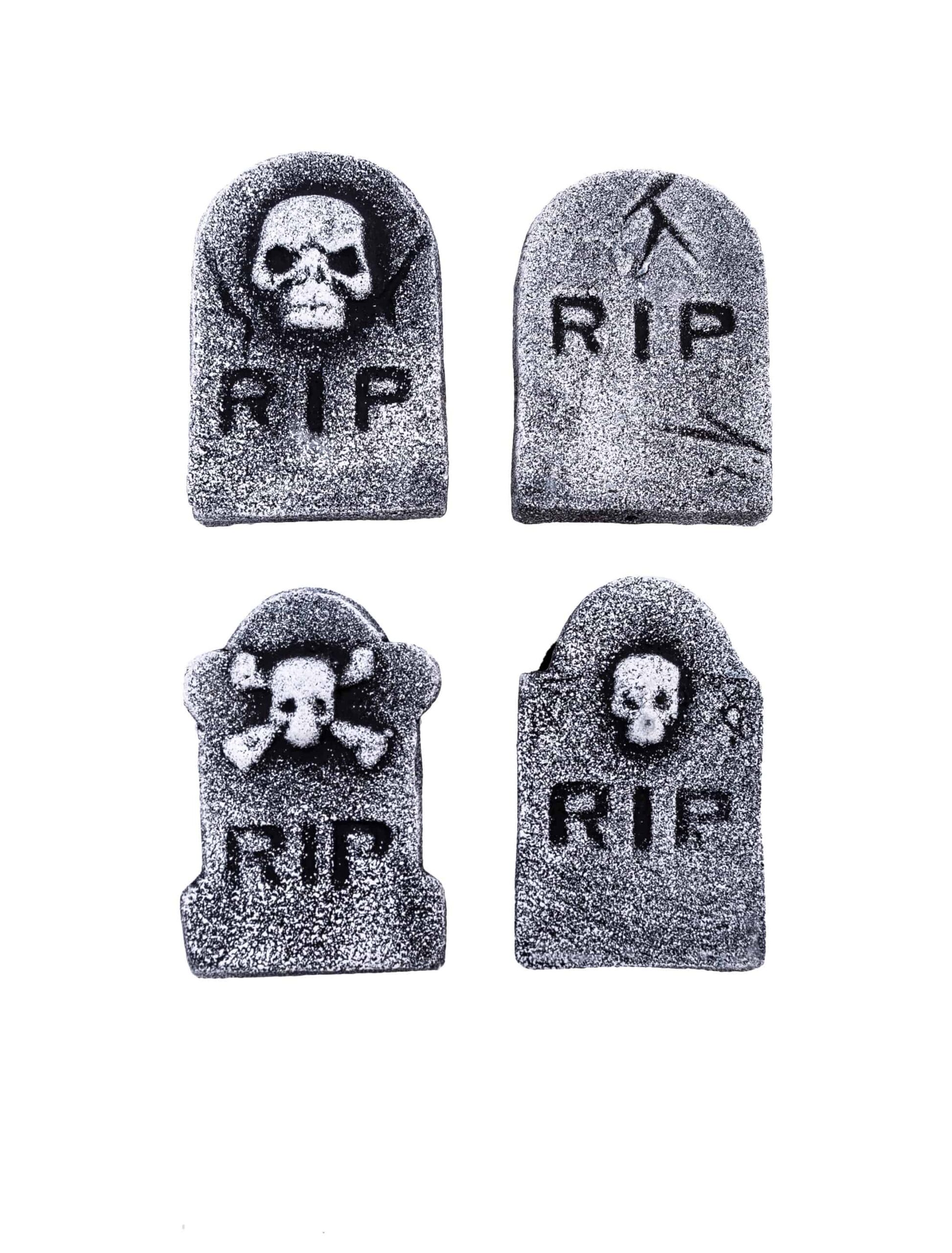 Diese vier kleinen Grabsteine aus hartem Schaumstoff sind eine witzige Party Deko für Deine Halloween Party oder für die Halloween Deko zu Hause. Sie sind jeweils 11 cm hoch und 7,5 cm breit. Du erhältst vier verschiedene Mini Grabsteine, die Du nach Belieben aufstellen und damit Tische, Kommoden oder Regale passend zu Halloween dekorieren kannst. Die witzigen Grabsteine dürfen am nächsten Halloween auf keinen Fall fehlen.