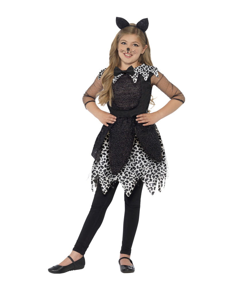 Schwarze Mitternachtskatze Mädchenkostüm Glitzerndes Katzenkostüm für Fasching, Halloween und Kindergeburtstage Mit dem Schwarzen Mitternachtskatze Mädchenkostüm wird deine Tochter zu einer niedlichen schwarze Katze. Mit den kleinen Öhrchen und dem Glitzerkleid wird sie zum Mittelpunkt jeder Party. Das Schwarze Mitternachtskatze Mädchenkostüm ist zweitteilig und besteht aus einem schwarzen Haarreif mit glitzernden Katzenohren und einem schicken schwarzen Kleid mit halblangen schwarzen Tüllärmeln mit silbernen Glitzerpunkten. Der Halsausschnitt ist mit einem spitz zugeschnittenen Kragen im weiß-schwarzen Leopardenlook und einer schwarzen Fliege verziert. Das schwarze Oberteil hat das katzentypische Lätzchen aus Glitzerstoff. Der weiße Rock ist im Leopardenlook und hat eine darübergelegte schwarze Tüllstoffschicht, die glitzert und drei schwarze darübergelegte Glitzervolants. Auf der Rückseite des Kleids ist ein kurzer, schwarz glitzernden Katernschwanz angebracht. Lieferumfang: 1 x Schwarze Mitternachtskatze Mädchenkostüm Inhalt: 1 x Haarreif, 1 x Kleid Farbe: schwarz/weiß/silber Größe: S, M Material: 100% Polyester Größe S ca. 4-6 Jahre M ca. 7-9 Jahre Gewicht ca. 16-20 kg ca. 25-33 kg Brustumfang ca. 58-64 cm ca. 69-72 cm Taillenumfang ca. 54-57 cm ca. 60-62 cm Körpergröße ca. 115-128 cm ca. 130-143 cm Achtung: Nicht geeignet für Kinder unter 3 Jahren, enthält Kleinteile die verschluckt werden können. Von offenem Feuer fernhalten. Nur für Handwäsche geeignet.