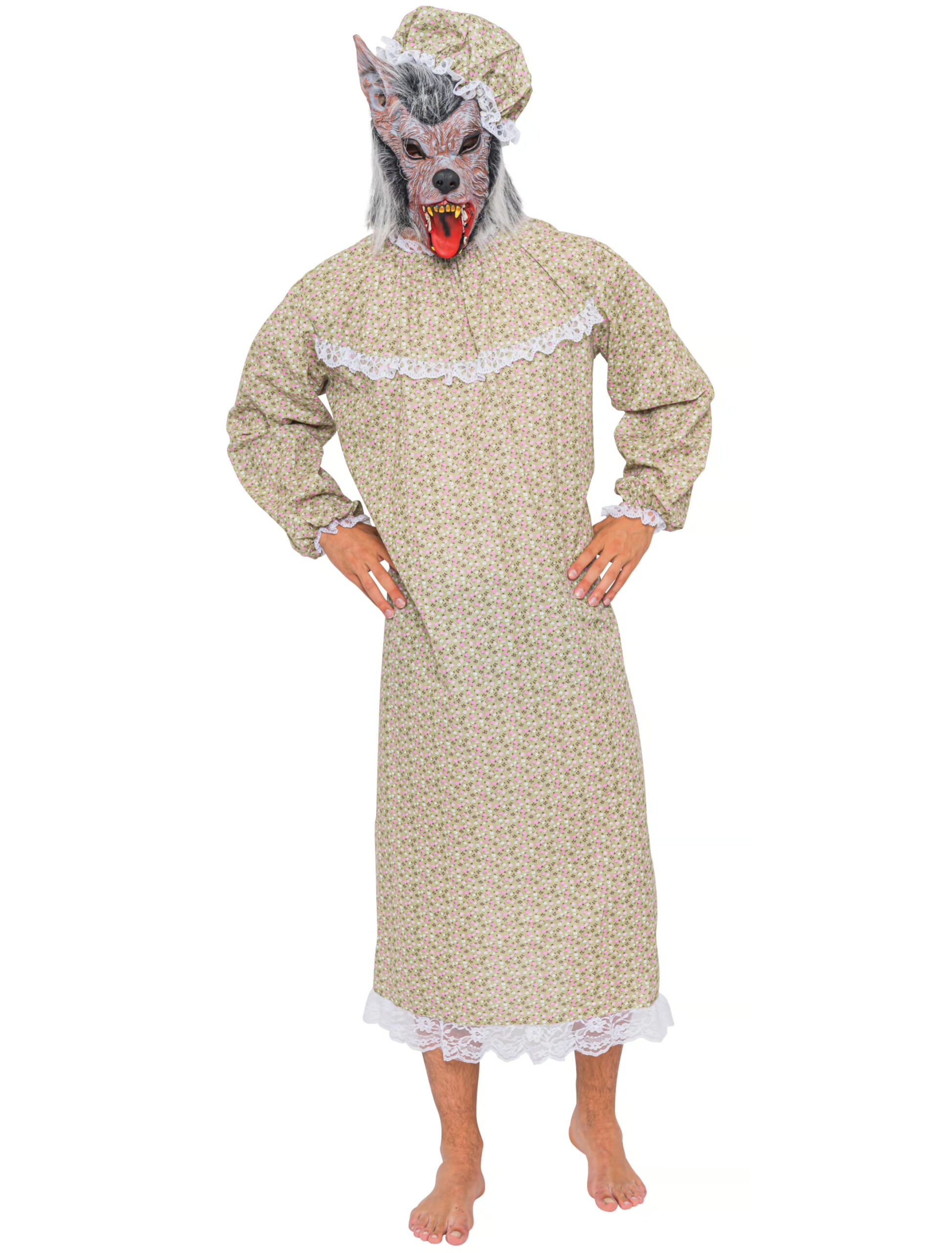 Immer noch sehr beliebt ist die Kostümierung mit Großmutters Nachthemd und Nachtmütze, mit der Du nicht nur zum Fasching und Karneval für spaßige Unterhaltung sorgst, sondern auch auf Junggesellenabschieden gut ankommst, zumal wenn sich herausstellt, das Du im Kostüm der durchgeknallten, flippigen Oma, steckst. Das lange, grüne Nachthemd mit den langen Ärmeln und dem Blümchenmuster sowie die dazugehörige Nachtmütze sind mit weißer Spitze eingefasst. Gummizüge an Ärmeln und Mütze garantieren den optimalen Sitz. Mit ein paar hübschen Accessoires aus unserem Shop wirst Du die perfekte, schrullige Oma, die überall für Aufsehen sorgt, und mit einer Wolfsmaske wirst Du zum bösen Wolf aus dem Märchen “Rotkäppchen”.