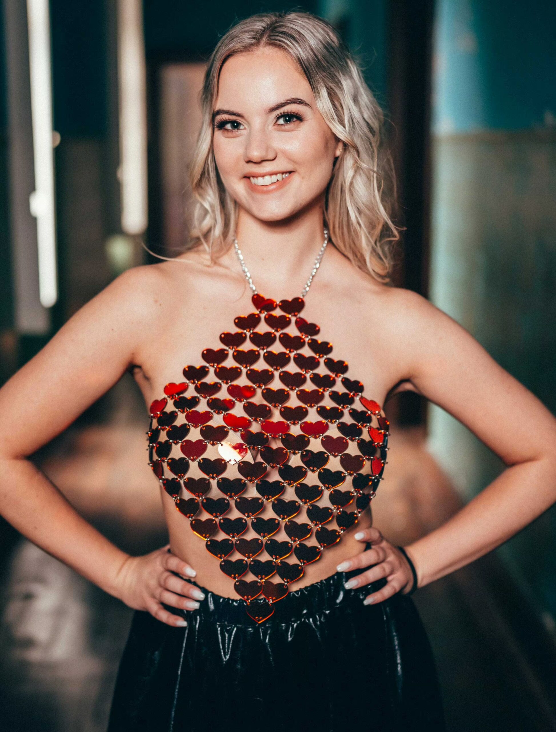 Dieser extravagante Neckholder besteht aus glänzenden Herzpailletten und ist komplett rückenfrei gestaltet. Perfekt für auffällige Party-Looks, Karneval oder Festivals. Dank verstellbarer Ketten lässt er sich individuell anpassen – ideal für einen glamourösen Auftritt.