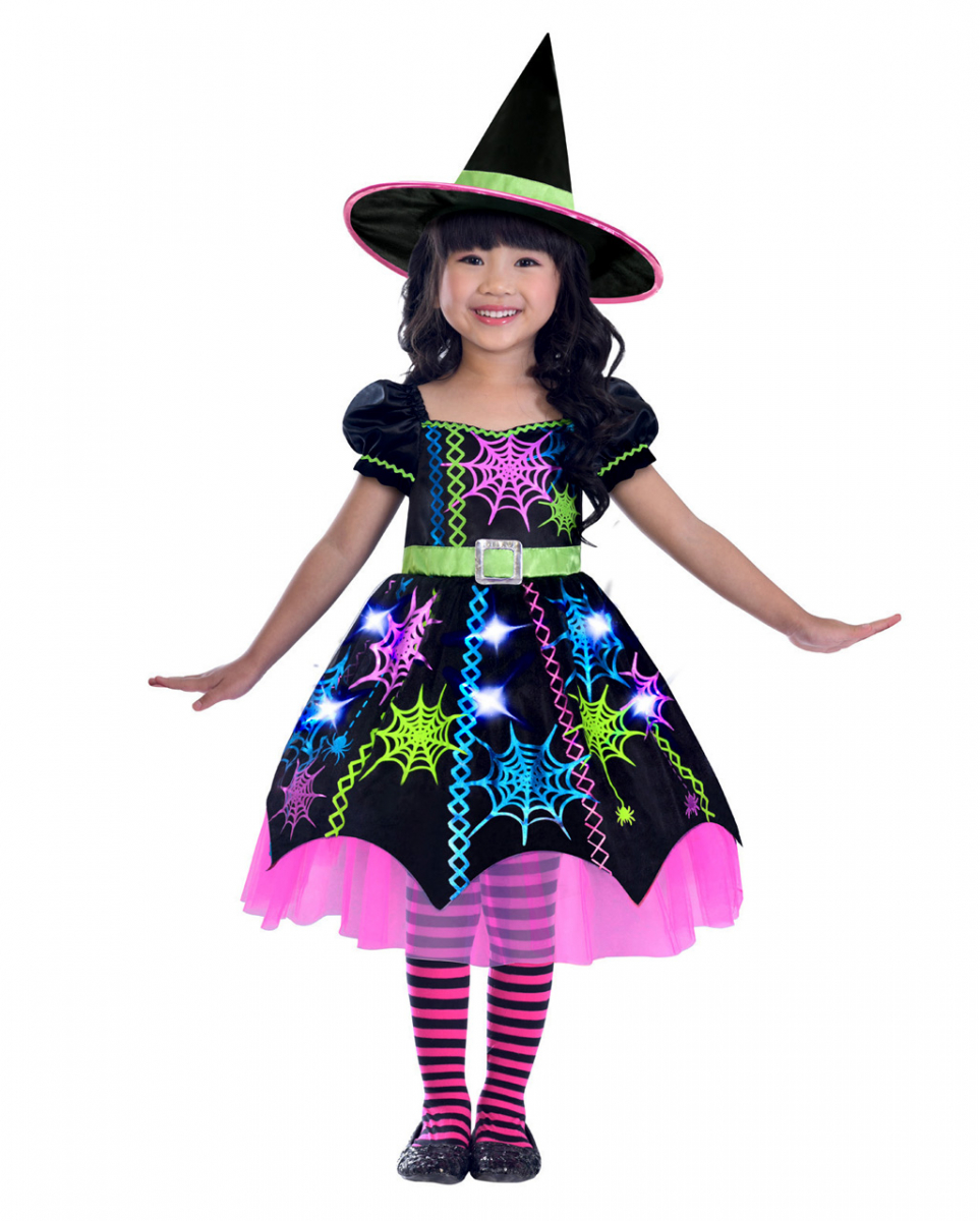 Spinnenhexe Kleinkinderkostüm im Neon Look für Halloween Magisch buntes Hexen Kostüm mit Hexenhut für kleine Mädchen Das Spinnenhexe Kleinkinderkostüm im Neon Look ist ein niedliches Kinderkostüm für den ersten Trick or Treat oder die erste Halloween Party. Als kleine Magierin wird eure Süße zum bezaubernden Mittelpunkt. Keine Frage, dass hier Magie im Spiel sein muss. Oder wie kommt es, dass plötzlich alles nach der Pfeifer der Nachwuchs-Hexe tanzt. Auch beim Kinderfasching und auf dem Kindergeburtstag ist die Hexen Verkleidung ein Blickfang. Mit dem Spinnenhexe Kleinkinderkostüm im Neon Look gehört die Kleine zu den süßesten Hexen aller Zeiten. Allein das Kostümkleid mit dem pinkfarbenen Tüll am schwarzen Rock ist mega bezaubernd. Das schwarze Hexenkleid zeigt als Hexenmotive bunte Spinnennetze, die dem Mädchenkleid zum Hingucker machen. Die schwarzen Ärmeln sind gepufft und gehören zu den tollen Details des Halloween Kostüms. Jetzt nur noch den schwarzen Hexenhut aufsetzen und los. Lieferumfang: 1 x Spinnenhexe Kleinkinderkostüm im Neon Look Inhalt: 1 x Hexenkostüm, 1 x Hexenhut Farbe: Schwarz, Orange, Grün, Pink Größe: 2-3 Jahre 96, 3-4 Jahre 104, 4-6 Jahre 110 Material: 100% Polyester Strumpfhose nicht inkl.