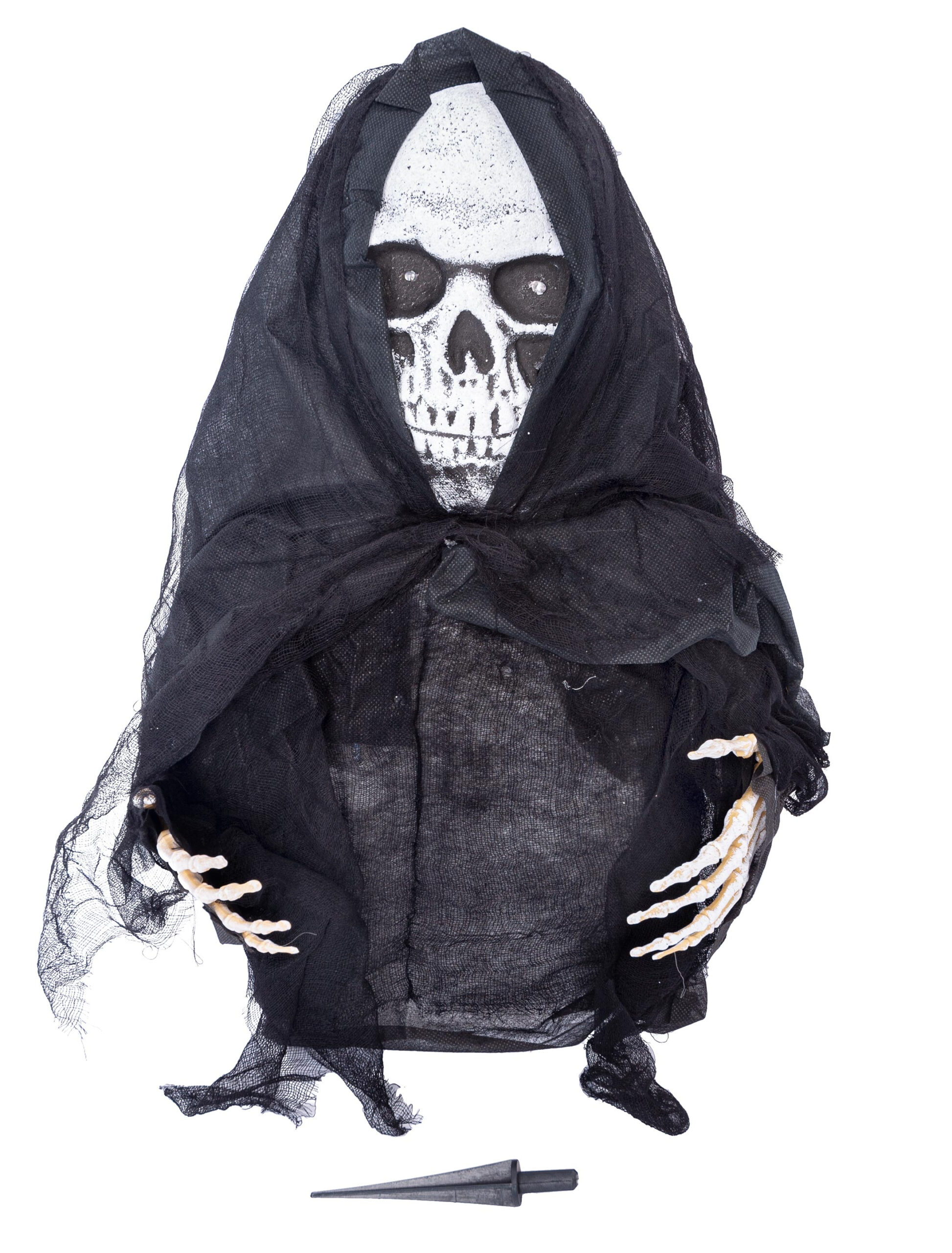 Diesen gruseligen Sensenmann kannst Du wunderbar als Garten Deko verwenden. Er passt auch wunderbar als Halloween Deko. Durch die leuchtenden Augen, welche auch die Farbe wechseln können, wird Deine Halloween Party ein sicherer Gruselspaß! Nichts ist gruseliger als der Sensenmann, welcher gerade langsam durch den Erdboden empor steigt. Mitgeliefert werden Batterien und ein Erdspieß, um ihn im Garten zu fixieren.