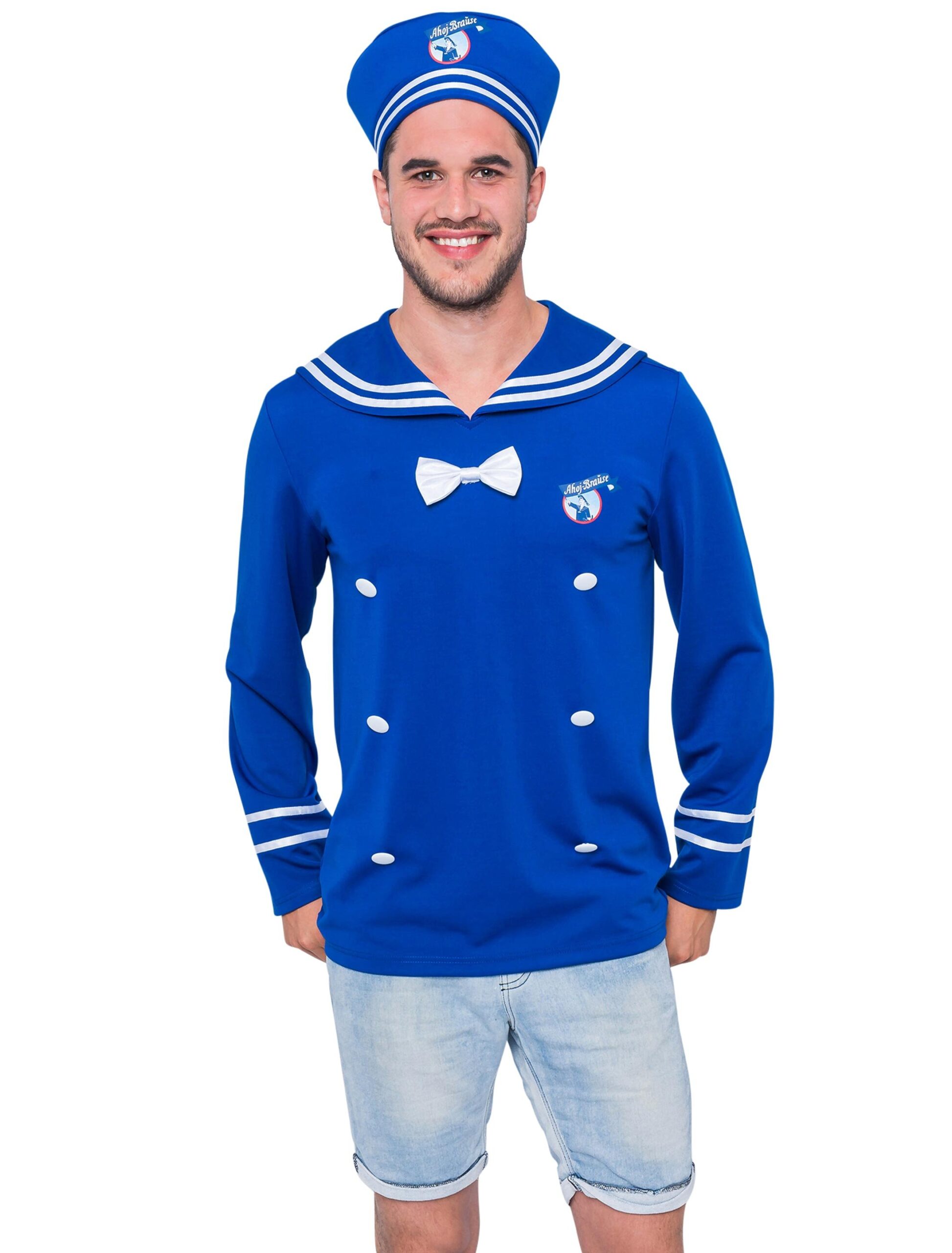 Land in Sicht! Mit dem Original Oberteil Ahoj-Brause für Herren wird aus Dir ein erfahrener Seemann. Das blaue Kostüm besitzt einen angenähten Matrosenkragen und ist mit einer weißen Schleife sowie zwei Knopfreihen verziert. Auf der linken Brust der Kultbrause-Verkleidung prangt das Ahoj-Brause Logo samt Schriftzug. Welche Größe Du benötigst, zeigt Dir unser abgebildetes Model, das 188 cm groß ist und die Größe M trägt. Jetzt günstig online bestellen und die nächste feuchtfröhliche Karnevalsparty kann steigen! Exklusiv bei uns. Offizielles Merchandise!