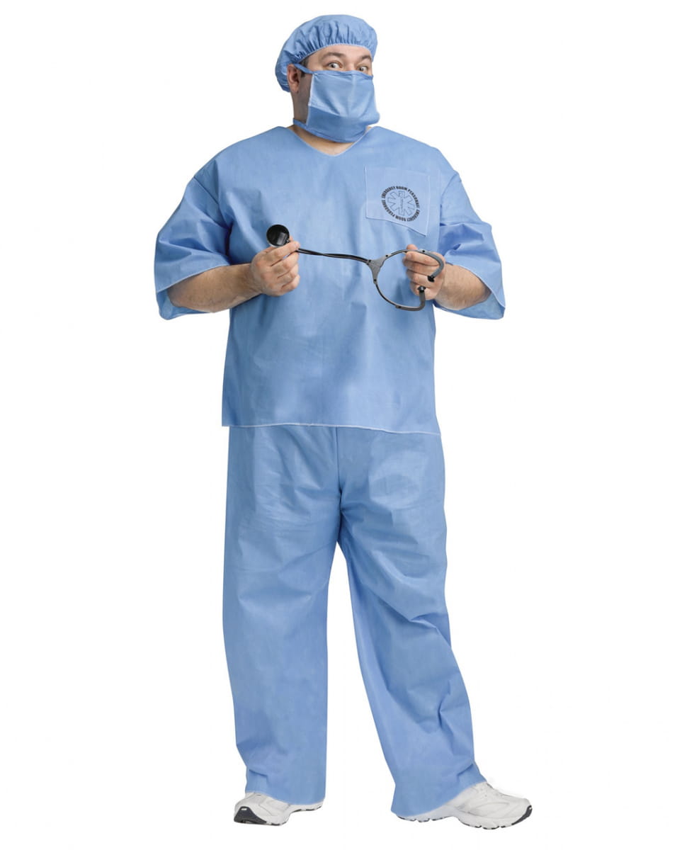 Chirurgen Kostüm Plus Size Unisex Faschingskostüm 5-teiliges Berufskostüm einer Krankenhausuniform Verkleide dich im Fasching, Karneval und Halloween als Schönheitschirurge und mache dich damit besonders bei weiblichen Patienten interessant. Das sehr realistisch aussehende Berufskostüm einer Chirurgen Uniform lässt dich als OP Doktor der Chirurgie erscheinen. In der Größe XL/XXL passt dieses 5-teilige Kostüm auch großen Männern mit etwas Gewicht auf den Rippen. Cooles Arzt Kostüm für Mottopartys und Karneval. Das OP Doktor Kostüm Plus Size ist ein authentisch wirkendes Chirurgen Set mit Hose, Oberteil, Haube und Mundschutz im blauen OP Look und passendem Stethoskop aus Kunststoff. Auf der Brusttasche des Oberteils mit V-Ausschnitt ist ein Krankenhaus Logo abgebildet. Der flexible Gummibund der Hose sorgt für hohen Tragekomfort. Lieferumfang: 1 x Chirurgen Kostüm Plus Size Inhalt: Hose, Oberteil, Haube, Mundschutz, Stethoskop Größe: XL/ XXL (90 bis120kg) Material: 35 % Baumwolle, 65 % Polyester Realistisches Berufskostüm Passt für Übergrößen Unisex verwendbar