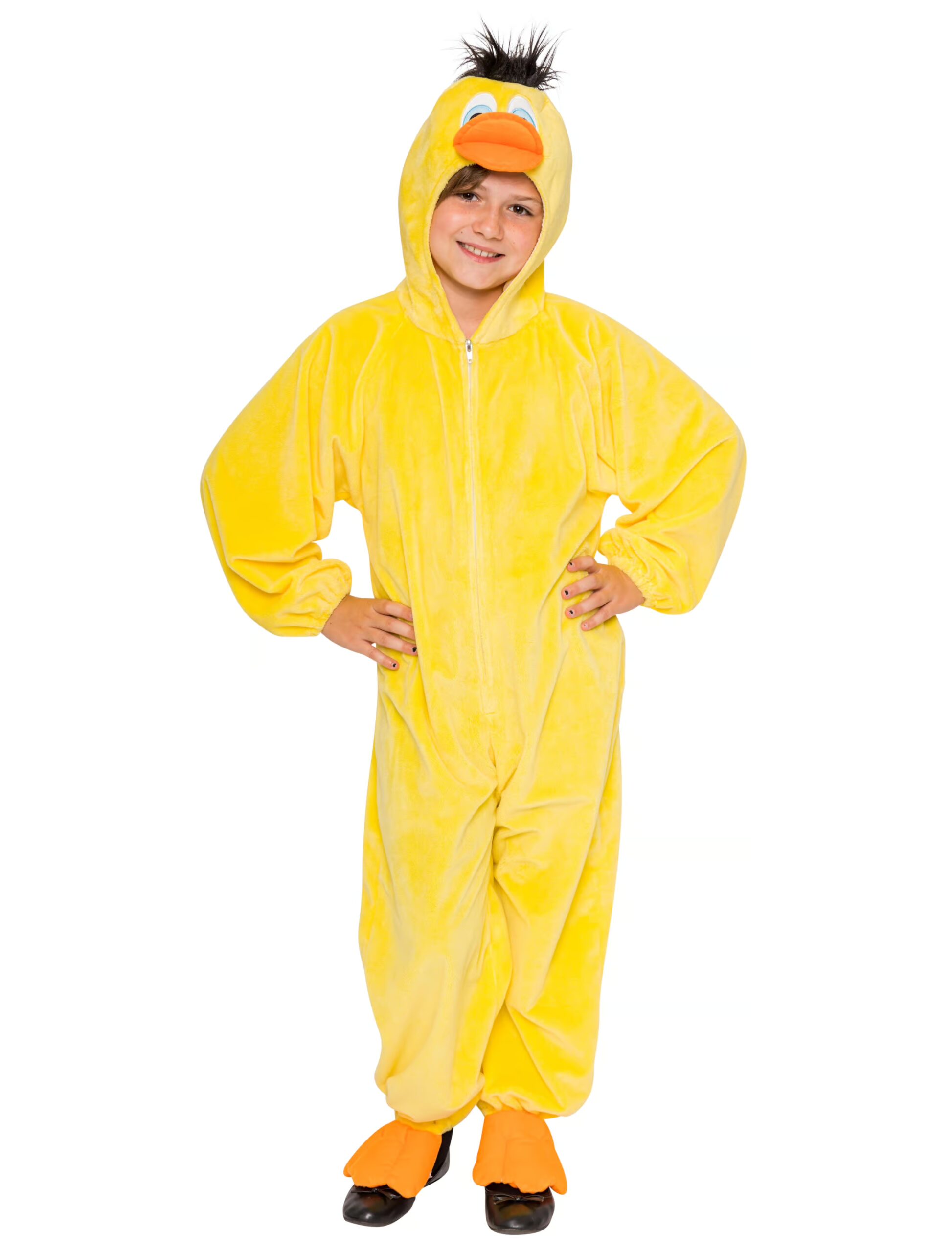 Den lustigen Entenanzug gibt es in vier Kindergrößen und passt schon ab dem Alter von achtzehn Monaten. Er ist aus 100% Polyester Plüschstoff genäht. Oben auf der Kapuze mit Gummizug ist ein Entenkopf mit Schnabel aufgesetzt. Praktische Hand- und Fußstulpen halten den Stoff an den Gelenken fest. An den Füßen sind zusätzliche Klettverschlüsse angebracht. Durch den praktischen Reißverschluss im Vorderbereich kannst Du den Overall leicht anziehen. Einfach in die Hose schlüpfen, den restlichen Anzug anziehen und schon geht es los. Schnell zur nächsten Kinderparty watscheln und losquaken!