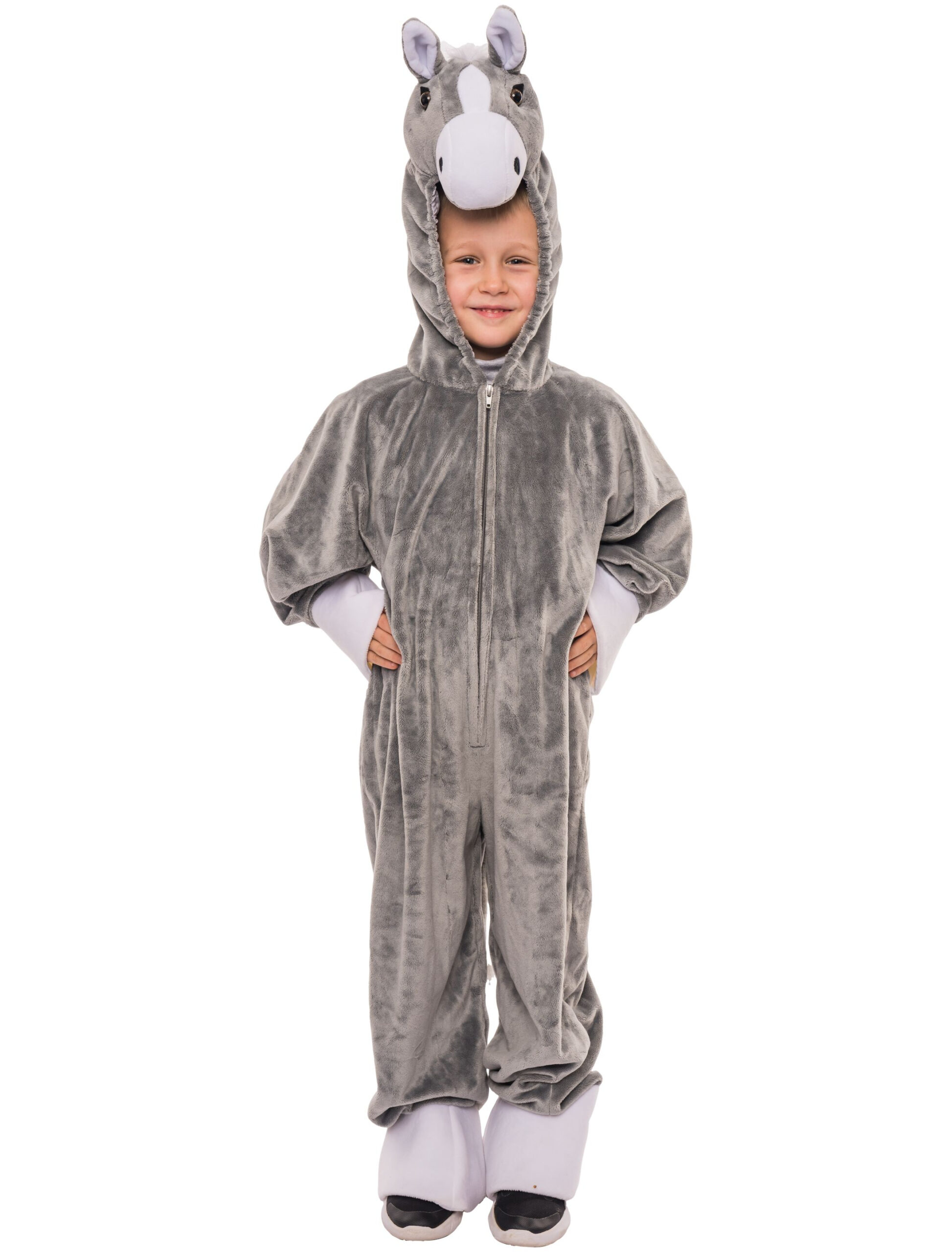 Du liebst alles was Hufe hat? Wie findest Du denn dieses kleine, graue Eselchen? In diesen grauen, weichen Overall kannst Du Dich bequem hineinkuscheln und der Welt Deine Hufe zeigen. Das Kostüm kannst Du bequem vorne mit einem Reißverschluss auf und zu machen. Arm und Beinsaum wurden zusätzlich mit festem, weißen Stoff versehen, damit Du auch wirklich schöne Hufe hast. Zusätzlich gibt es natürlich auch ein graues Schwänzchen mit weißer Fellspitze. Die Kapuze trägt den süßen Kopf des Esels. Und als Bonus: Ein süßes rotes Halstuch! Damit bist Du einzigartig auf der nächsten Kostümparty!