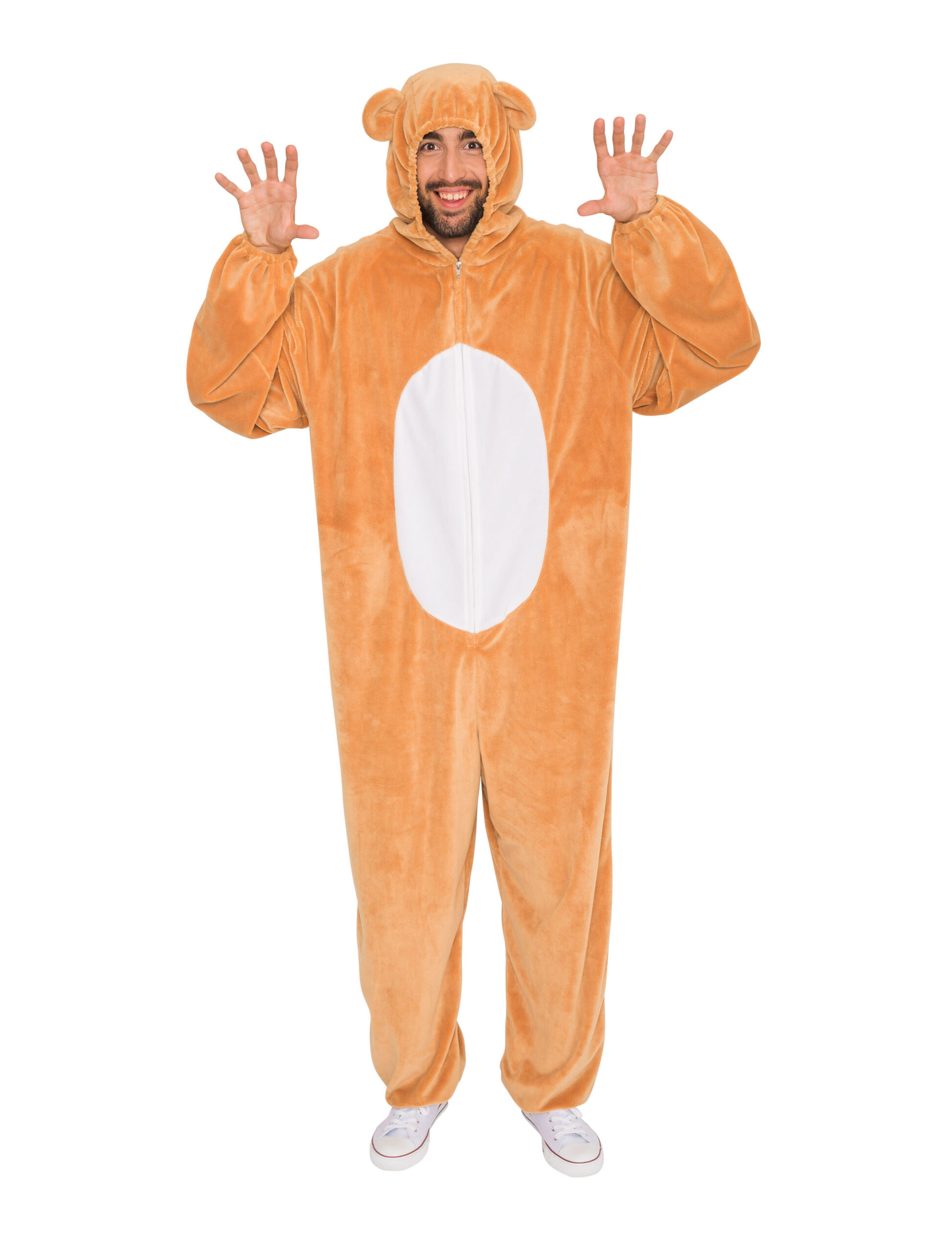 Einfach zum Knuddeln! Dieses süße und zugleich praktische Bärchen-Kostüm in Braun ist Dein perfekter Begleiter für die kalten Tage! Einfach ausreichend Kleidung anziehen, in den Herren Overall schlüpfen, mit dem Reißverschluss schließen und schon ist Deine tierische Verkleidung perfekt! Der kuschelige, braune Stoff ist in der Front mit weißem Stoff verziert, der einen hübschen Kontrast bildet. Die süße Kapuze ist mit kleinen Bären-Öhrchen bestückt. Der kleine Puschelschwanz rundet Dein kuscheliges Kostüm gekonnt ab!
