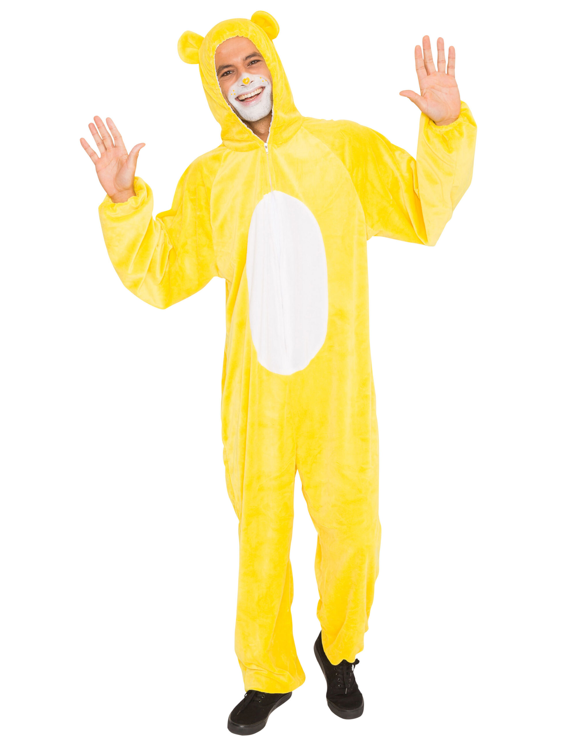 Du suchst nach einem Bärenkostüm in verschiedenen Farben für Karneval und Fasching? Dieser gelbe Bären Plüschoverall für Herren passt doch perfekt. Der Overall besitzt einen Bärchen-Kopf als Kapuze, der mit einem Gummizug versehen ist. Mit der Hilfe eines Reißverschlusses in der Front wird der Overall verschlossen. Die Fuß- und Ärmelenden sind ebenfalls mit Gummizügen versehen und sind für die Hände und Füße mit Gummibänden ausgestattet, um sie einfach umzubinden. Ein Puschelschwanz ist ebenfalls an dem Overall vernäht.
