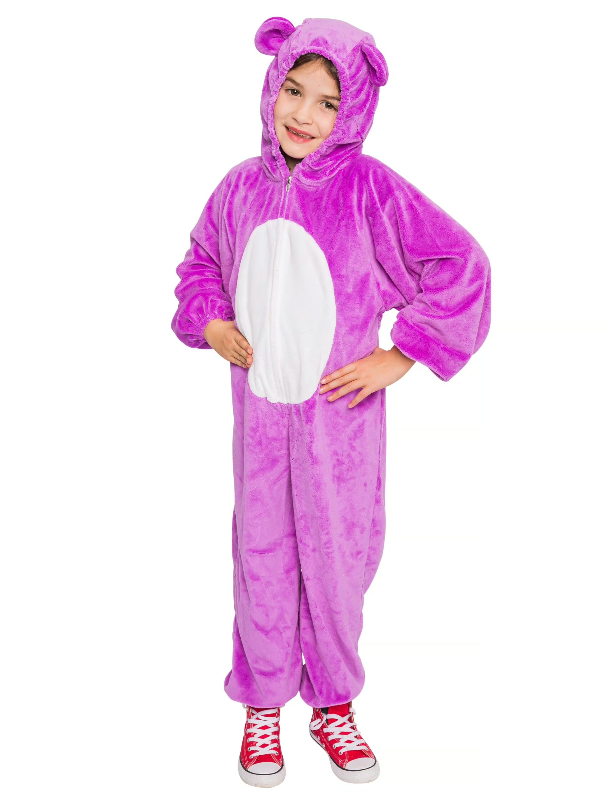 Du suchst nach einem Bärenkostüm in verschiedenen Farben für Karneval und Fasching? Dieser lilafarbene Bären Plüschoverall für Kinder in Größe 98-128 passt doch perfekt. Der Overall besitzt einen Bärchen-Kopf als Kapuze, der mit einem Gummizug versehen ist. Mit der Hilfe eines Reißverschlusses in der Front wird der Overall verschlossen. Die Fuß- und Ärmelenden sind ebenfalls mit Gummizügen versehen und sind für die Hände und Füße mit Gummibänden ausgestattet, um sie einfach umzubinden. Ein Puschelschwanz ist ebenfalls an dem Overall vernäht.
