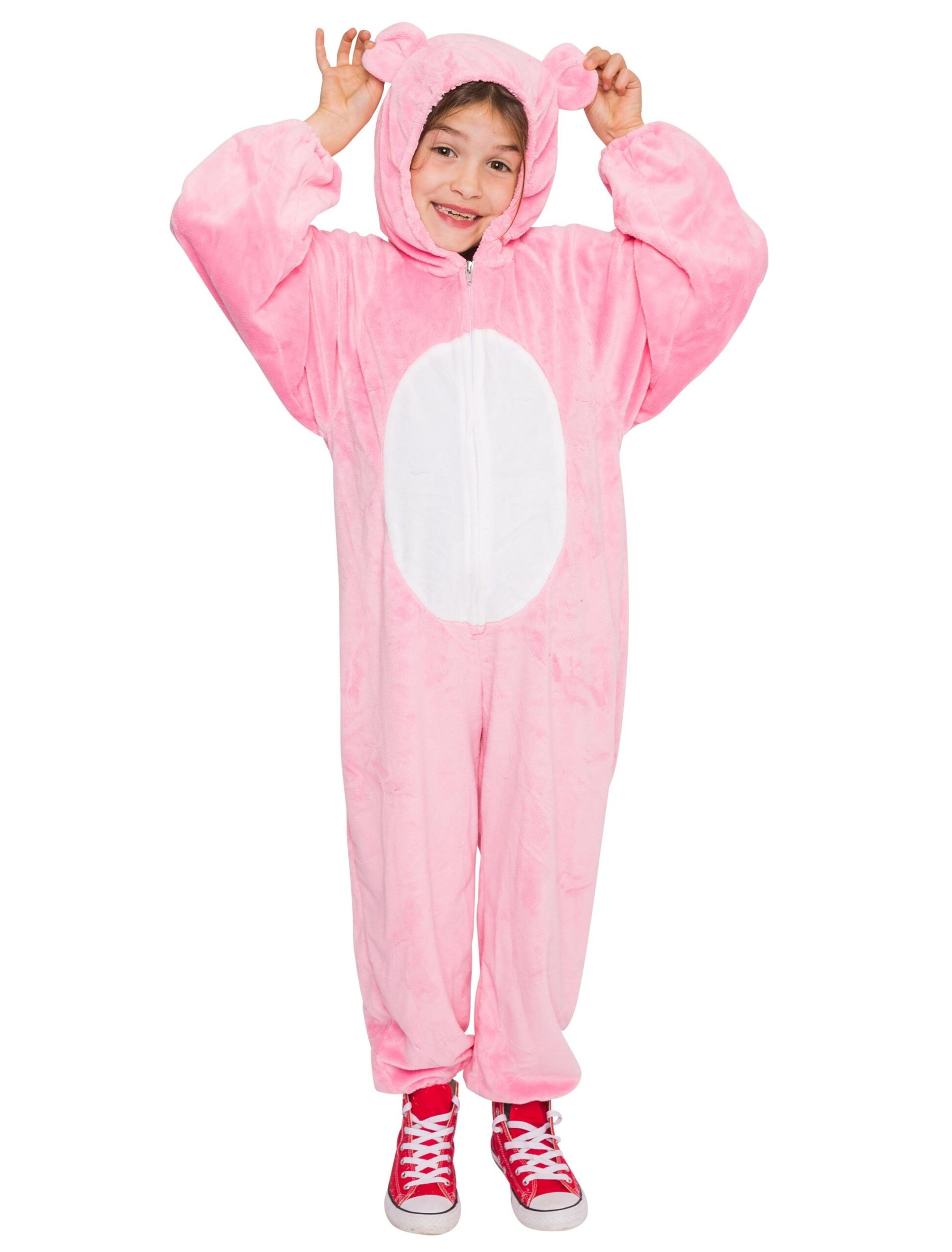 Du suchst nach einem Bärenkostüm in verschiedenen Farben für Karneval und Fasching? Dieser pinke Bären Plüschoverall für Kinder in Größe 98-128 passt doch perfekt. Der Overall besitzt einen Bärchen-Kopf als Kapuze, der mit einem Gummizug versehen ist. Mit der Hilfe eines Reißverschlusses in der Front wird der Overall verschlossen. Die Fuß- und Ärmelenden sind ebenfalls mit Gummizügen versehen und sind für die Hände und Füße mit Gummibänden ausgestattet, um sie einfach umzubinden. Ein Puschelschwanz ist ebenfalls an dem Overall vernäht.