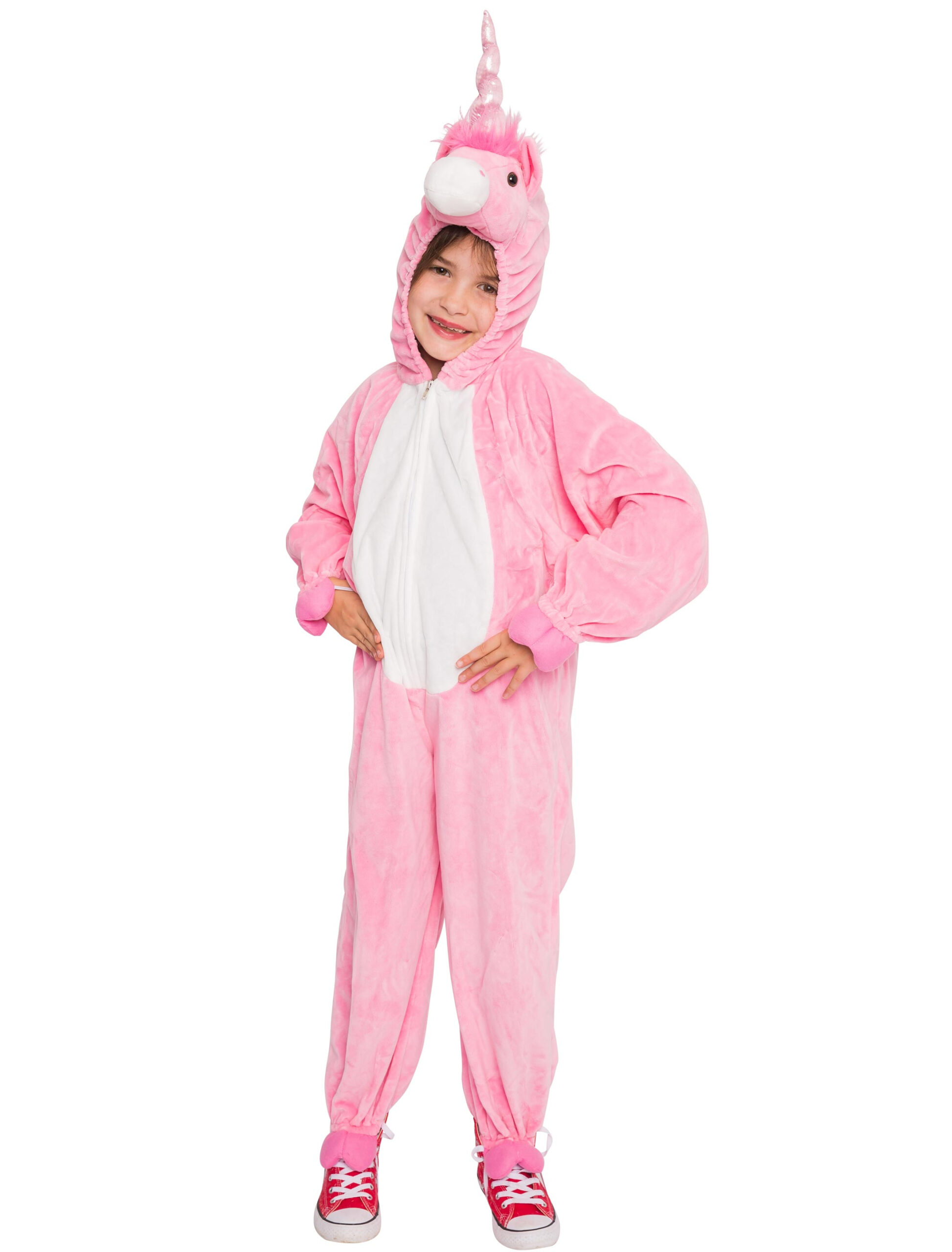Wer sagt “Einhörner gibt es nicht!” hat garantiert noch nie dieses Kostüm gesehen! Der süße plüschige Overall für Kinder in Größe 98 bis 128 ist für den Straßenkarneval garantiert das perfekte Kostüm! Der kuschelige Overall ist aus rosa Plüsch-Stoff gefertigt und wird im Brustbereich mithilfe eines praktischen Reißverschlusses verschlossen. Das Kostüm verfügt an den Ärmeln und Beinen über Gummizüge, die idealen Tragekomfort garantieren. Der Overall besitzt eine Kapuze mit Gummizug in Form eines Einhornkopfes, der mit einem silberglänzenden Horn und rosa Plüsch-Mähne ausgestattet ist. Im Gesäßbereich befindet sich ein süßer rosa Schweif. Dieses Kostüm ist ein wahrer Traum für alle Mädchen und solche die es gerne wären! Überzeuge als rosa Fabelwesen auf Deiner Party – der Kuschelfaktor ist dir gesichert!