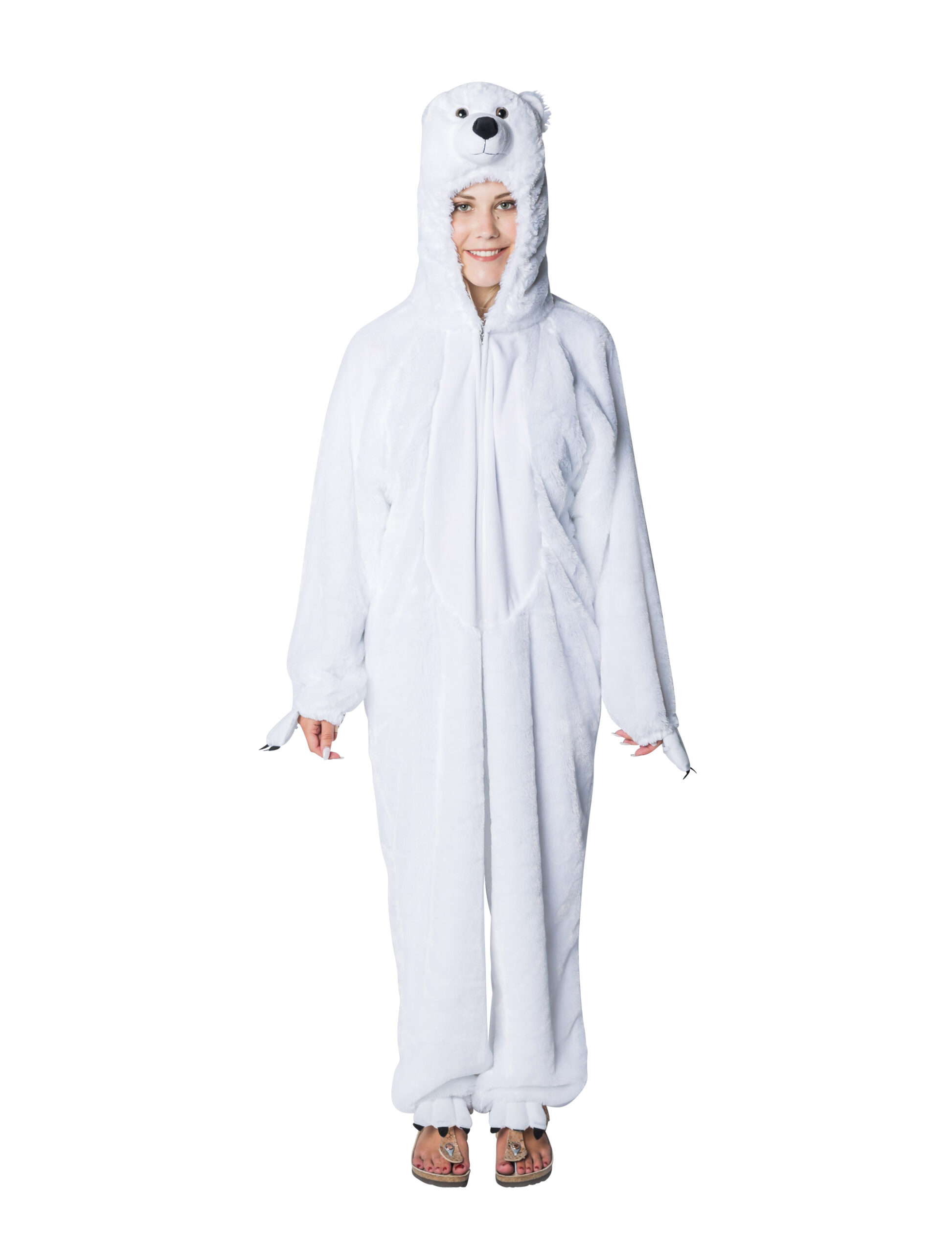 Ein äußerst seltener Anblick! Mit unserem Eisbären Overall für Damen verwandelst Du Dich im Nu in einen seltenen Eisbären! Der weiße Overall besteht aus einem kuschelig-weichen Stoff, der Dich auch auf dem kalten Straßenkarneval schön warm hält. Die süße Kapuze, die am Overall vernäht ist, ist für den perfekten Sitz mit Gummizügen versehen. Auch die Eisbär-Tatzen lassen sich mit Hilfe von Gummibändern bequem befestigen. Durch den praktischen Reißverschluss in der Front kannst Du Dein Kostüm bequem aus- und anziehen. Der süße Puschelschwanz auf der Rückseite rundet das tierische Komplettlösung gekonnt ab!