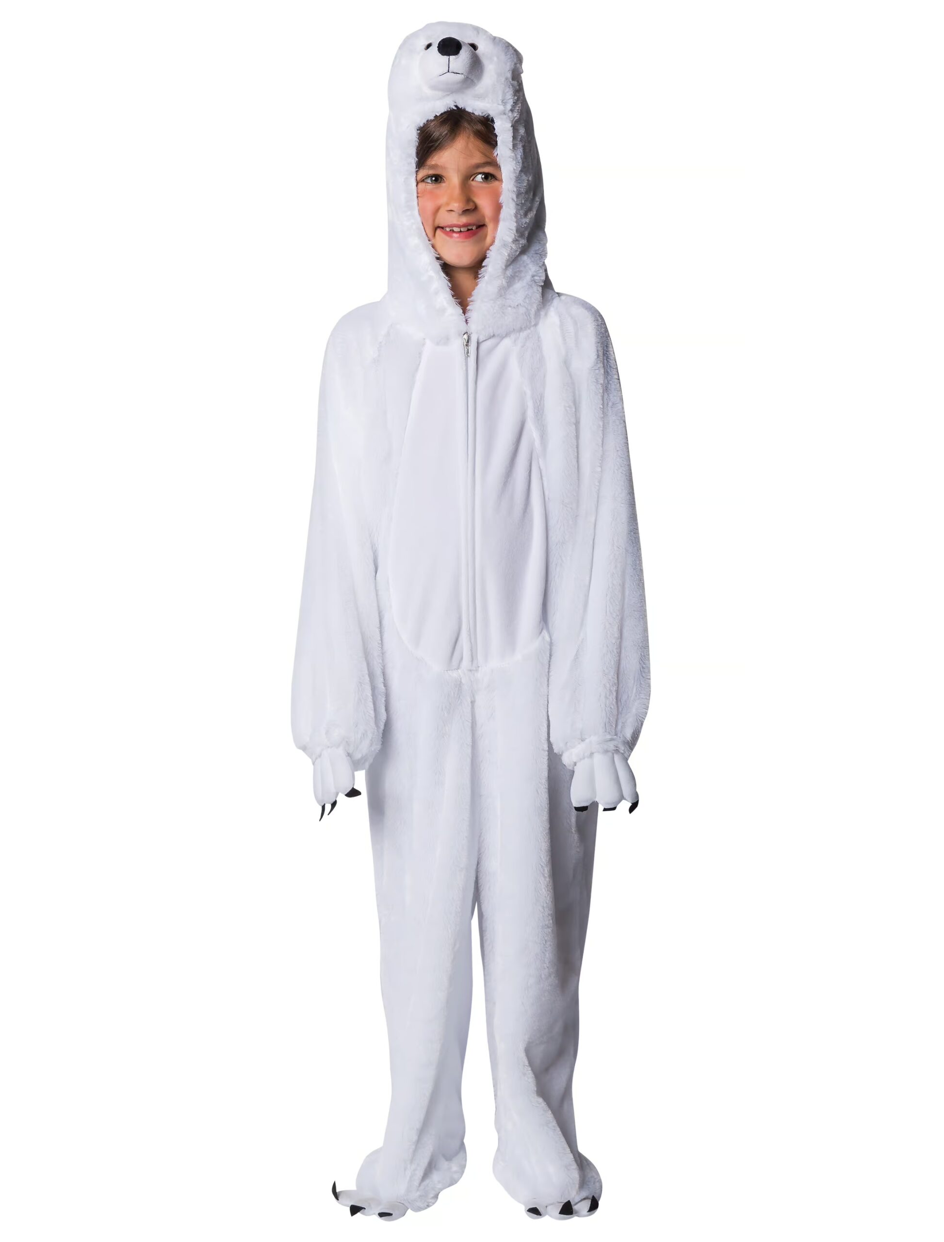 Du suchst nach einem warmen Kostüm für die kalten tollen Karnevalstage? Dann bist Du bei diesem Eisbären Kostüm aus Plüsch für Kinder in Größe 116/128 richtig. Der Overall besitzt einen Eisbären-Kopf als Kapuze, der mit einem Gummizug versehen ist. Mit der Hilfe eines Reißverschlusses in der Front wird der Overall verschlossen. Die Fuß- und Ärmelenden sind ebenfalls mit Gummizügen versehen und sind für die Hände und Füße mit Gummibänden ausgestattet, um die Tatzen einfach umzubinden. Ein Puschelschwanz ist ebenfalls an dem Overall vernäht.