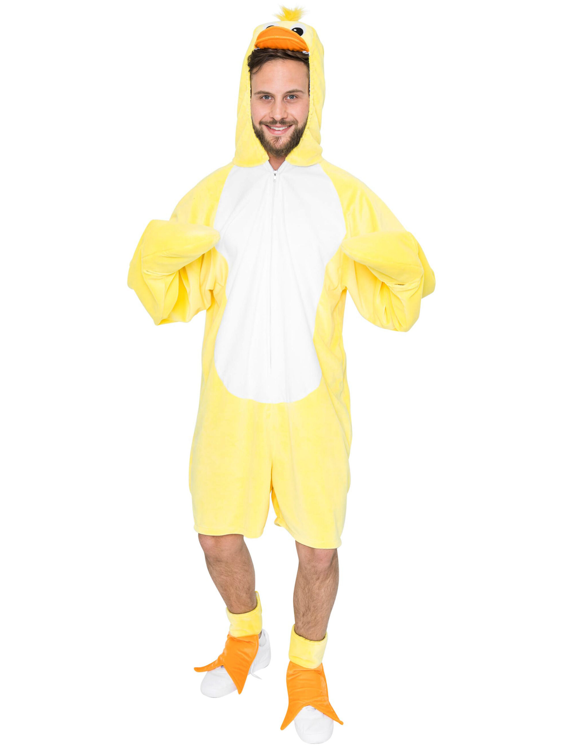 Sei der Mittelpunkt auf jeder Kostümparty oder trage diesen niedlichen Enten-Overall aus Plüsch doch einfach Zuhause. Die niedliche Entenkopf-Mütze mit Gummizügen kann Dir nicht verrutschen und die Handstulpen an den Ärmeln, sowie die dazugehörigen Fußstulpen, die mit einem Gummiband und Klettverschluss versehen sind, runden Dein ganzes Kostüm als gelbe Ente perfekt ab. Mit dem dezenten Reißverschluss, auf der Vorderseite, bekommst Du Dein Kostüm schnell an und wieder ausgezogen und dank der kurzen Hose, kommst Du nicht so schnell ins Schwitzen, wenn Du den Ententanz machst.