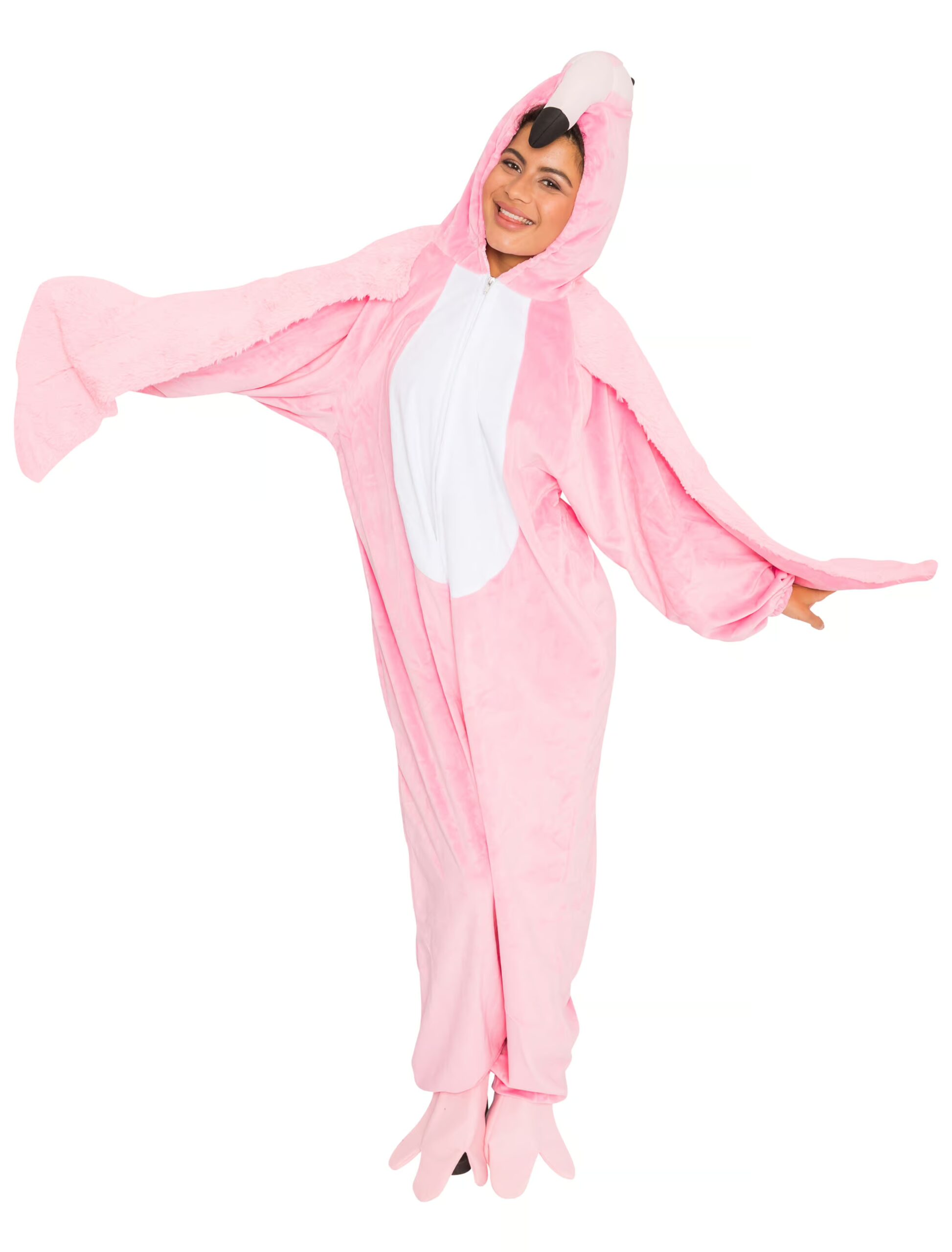 Du bist auf der Suche nach einem warmen Flamingo Kostüm für Karneval und Fasching? Dann passt dieser pinke Flamingo Plüschoverall für Damen doch perfekt. Der Overall besitzt einen Flamingo-Kopf als Kapuze, der mit Gummizügen versehen ist. Zum Verschließen ist ein Reißverschluss in der Front. Die Flügel sind an den Ärmeln vernäht. Die Fußenden sind mit Vogelfüßen und einem Gummiband zum Umbinden versehen.
