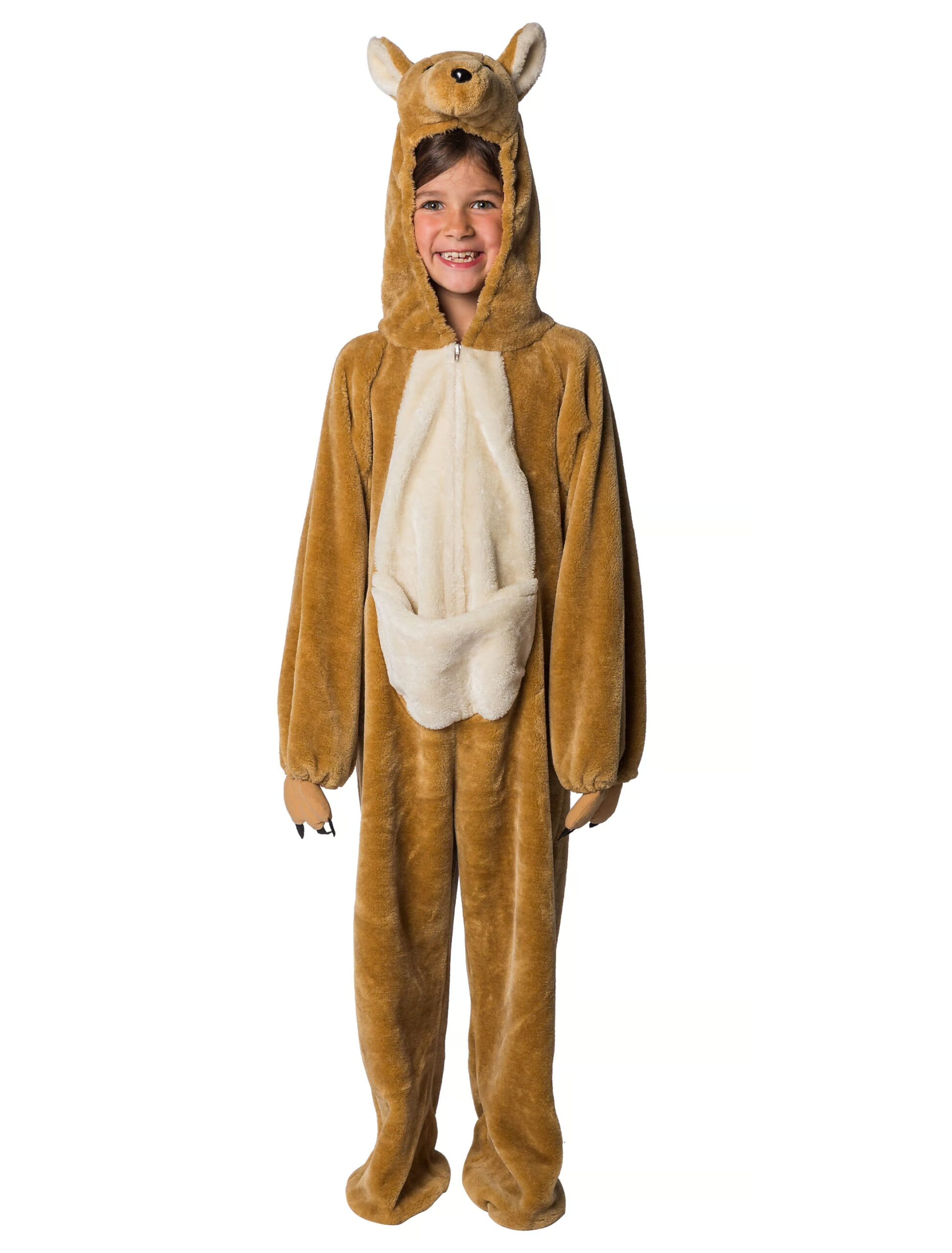 Was bist Du denn für ein schönes Beuteltier? Bist Du gerade von Australien bis hier her gehüpft… Der Kinder Plüsch Overall in Größe 98-128 besitzt einen Känguru-Kopf als Kapuze, der mit einem Gummizug versehen ist. Mit der Hilfe eines Reißverschlusses in der Front wird der Overall verschlossen. Die Fuß- und Ärmelenden sind ebenfalls mit Gummizügen versehen und sind für die Hände und Füße mit Gummibänden ausgestattet, um sie einfach umzubinden. Ein Schwanz ist am hinteren Teil vernäht.Der Overall besteht aus 100% Polyester.