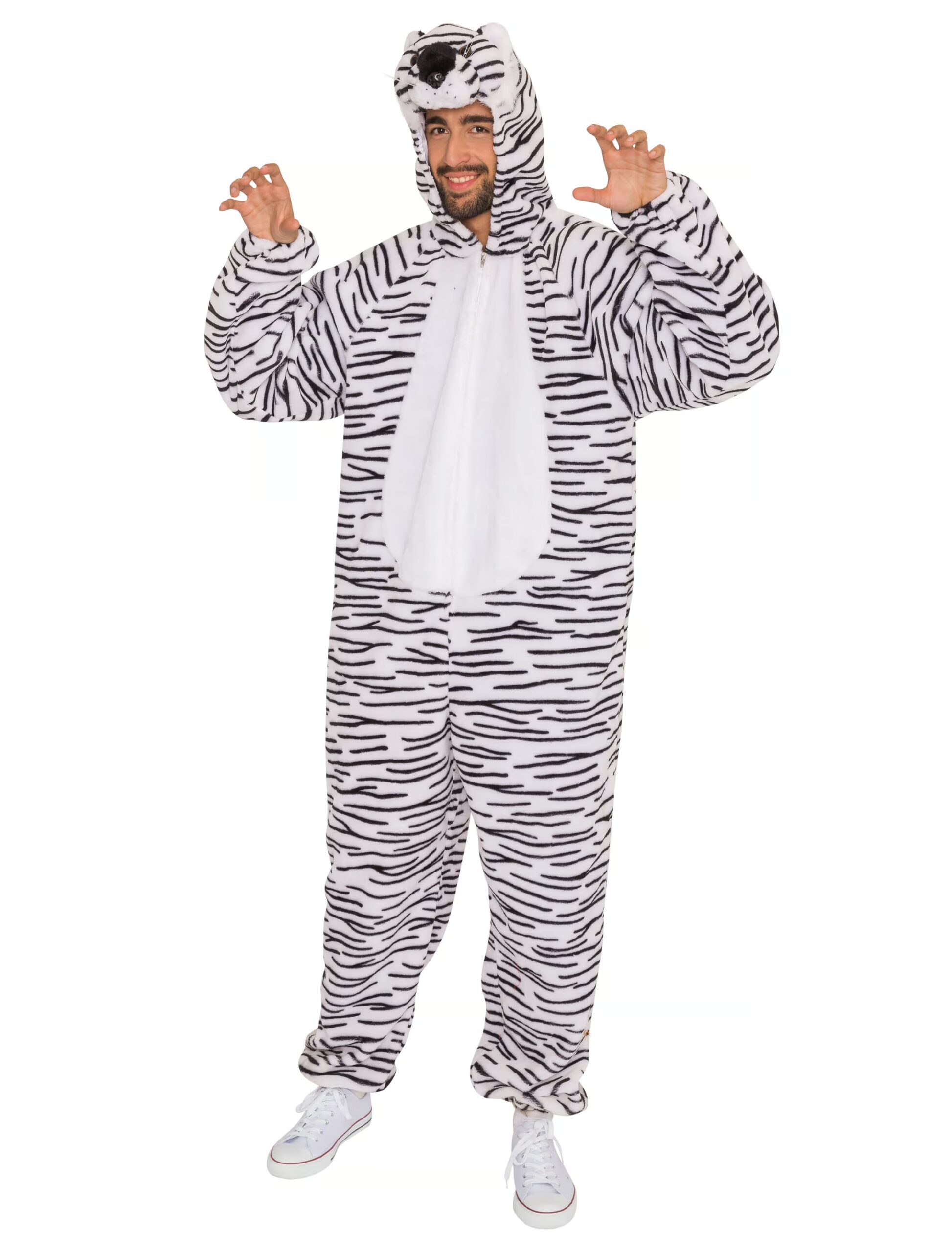 Nichts ist edler und eleganter als ein weißer Tiger! Verkleide Dich als wahrer König unter den Tieren und feiere den Straßenkarneval im warmen und kuschligen Overall! Das Herren Kostüm ist aus weißem Stoff in Tiger Musterung gefertigt und im Bauchbereich mit einem weißen Tigerbauch verziert. Der Overall wird mithilfe eines Reißverschlusses in der Front verschlossen und verfügt über praktische Gummizüge an Händen und Füßen. Besonderer Clou ist die Kapuze, die den Tiger Kopf bildet und majestätisch über die anderen Teilnehmer hinwegblickt! Der lange Tigerschwanz im Gesäßbereich komplettiert Deinen Wildkatzen-Look. Das Kostüm ist garantiert ein Hingucker auf Deiner Karnevals- oder Mottoparty und macht Dich zum König unter allen Tieren!
