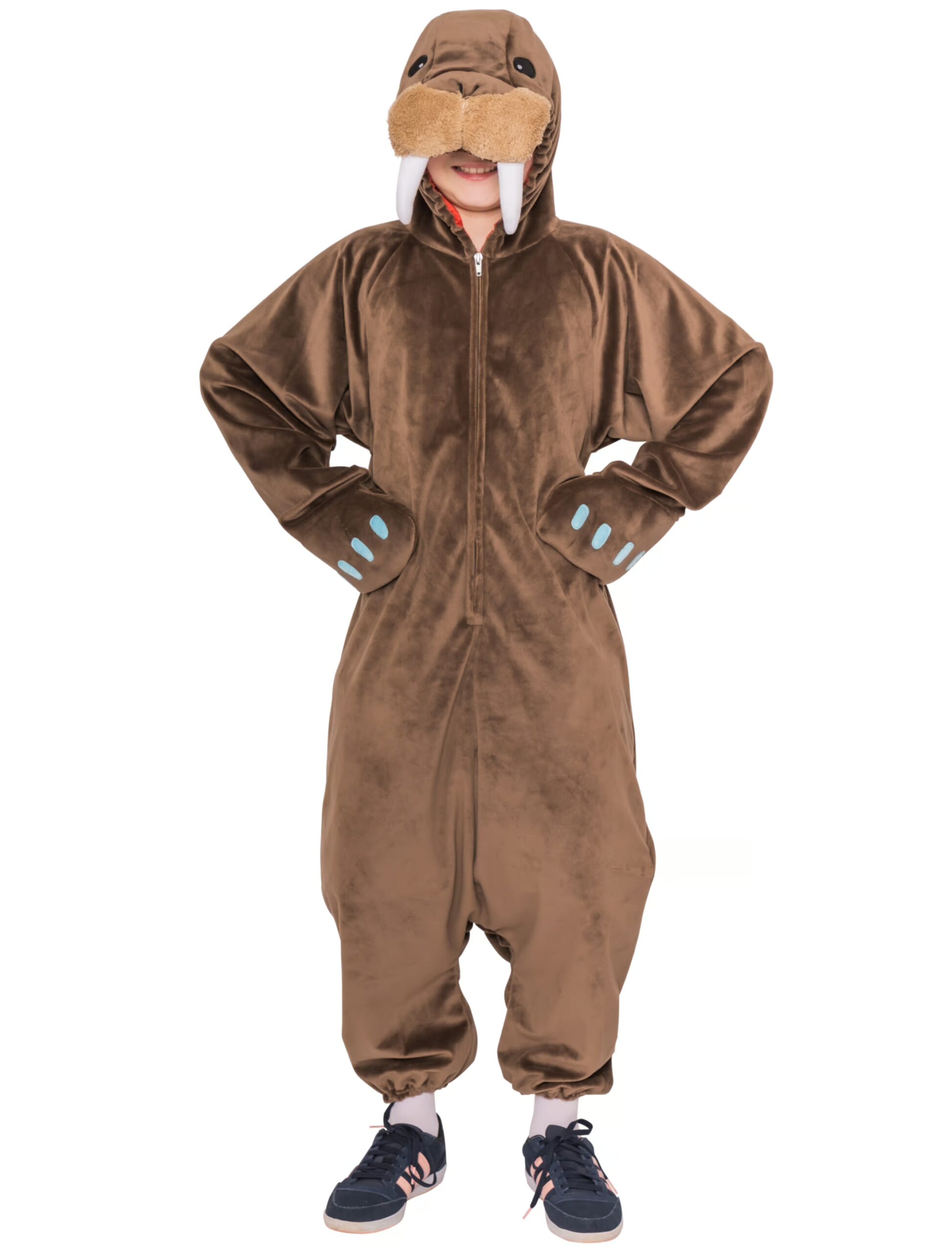 Egal für welches Motto, ob Eiszeit, Zirkus oder Zoo, mit dem braunen Walross Overall im kuscheligen Plüsch-Stoff macht das Verkleiden immer Spaß. Durch den Reißverschluss auf der Vorderseite ist das Kostüm schnell an- und ausgezogen und ist damit auch ein idealer Alltagsbegleiter zum Kuscheln und Spielen. Die Hände werden zu Schwimmflossen und durch die Kapuze erhält Dein Kind gefährliche weiße Stoßzähne und ein Walross-Kopf. Der Overall ist in verschiedenen Größen und sogar als Erwachsenen-Kostüm erhältlich. Das macht das Walross zu einem super Familien- oder Paarkostüm.