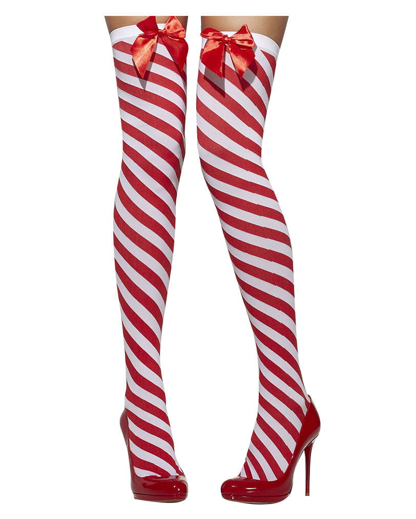 Fever Overknees rot-weiß gestreift Aufregende Candy Overknees im Zuckerstangen Look Die Fever Overknees sind rot-weiß gestreift und bestehen aus 100% Nylon. Auf der Vorderseite sind jeweils zwei rote Satinschleifen angebracht. Ein angenehmer Gummibund hält die Strümpfe auf Position. Lieferumfang: 1 x Fever Overknees Farbe: rot-weiß Material: 100% Nylon One Size gestreift rote Satinschleife