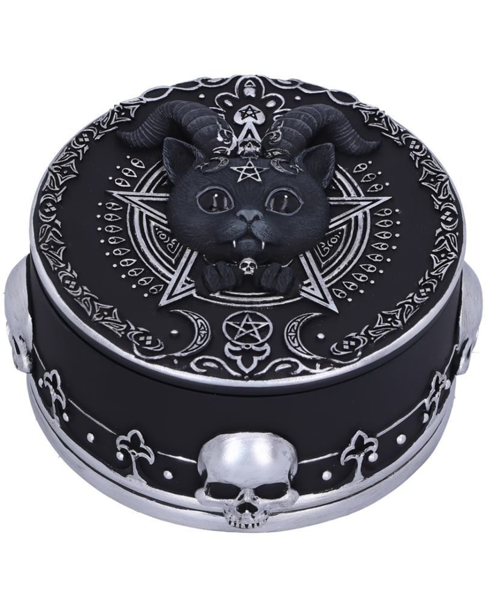 Pawzuph Hexenkatze Schmuck-Schatulle 11cm Schmuckdose mit okkultem Kätzchen und mystischen Symbolen als Gothic Homeware Die Pawzuph Hexenkatze Schmuck-Schatulle aus der Cult Cuties Serie bringt eine Prise Geheimnis und Gothic-Charme in dein Zuhause. Umgeben von okkulten Symbolen bewahrt die schwarze Katze mit Ziegenhörnern und Vampirzähnen deine Lieblingsstücke sicher auf. Die Pawzuph Hexenkatze Schmuck-Schatulle ist aus hochwertigem Polyresin gefertigt. Der Deckel lässt sich leicht abnehmen, was dir schnellen Zugriff auf den Inhalt ermöglicht. Jede Schmuckdose wird von Hand bemalt, wodurch jedes Stück zum Kunstwerk wird. Lieferumfang: 1 x schwarzen Katze, die Ziegenhörner und Vampirzähne 11cm Farbe: Schwarz, Silber, Grau Größe: ca. 11 cm Material: Polyresin (Kunststein) Pawzuph Schmuckdose aus der Cult Cuties Serie Schwarze Katze mit Ziegenhörnern und Vampirzähnen als Motiv Okkulte Symbole als Verzierung Abnehmbarer Deckel Aus feinstem Polyresin gegossen und von Hand bemalt