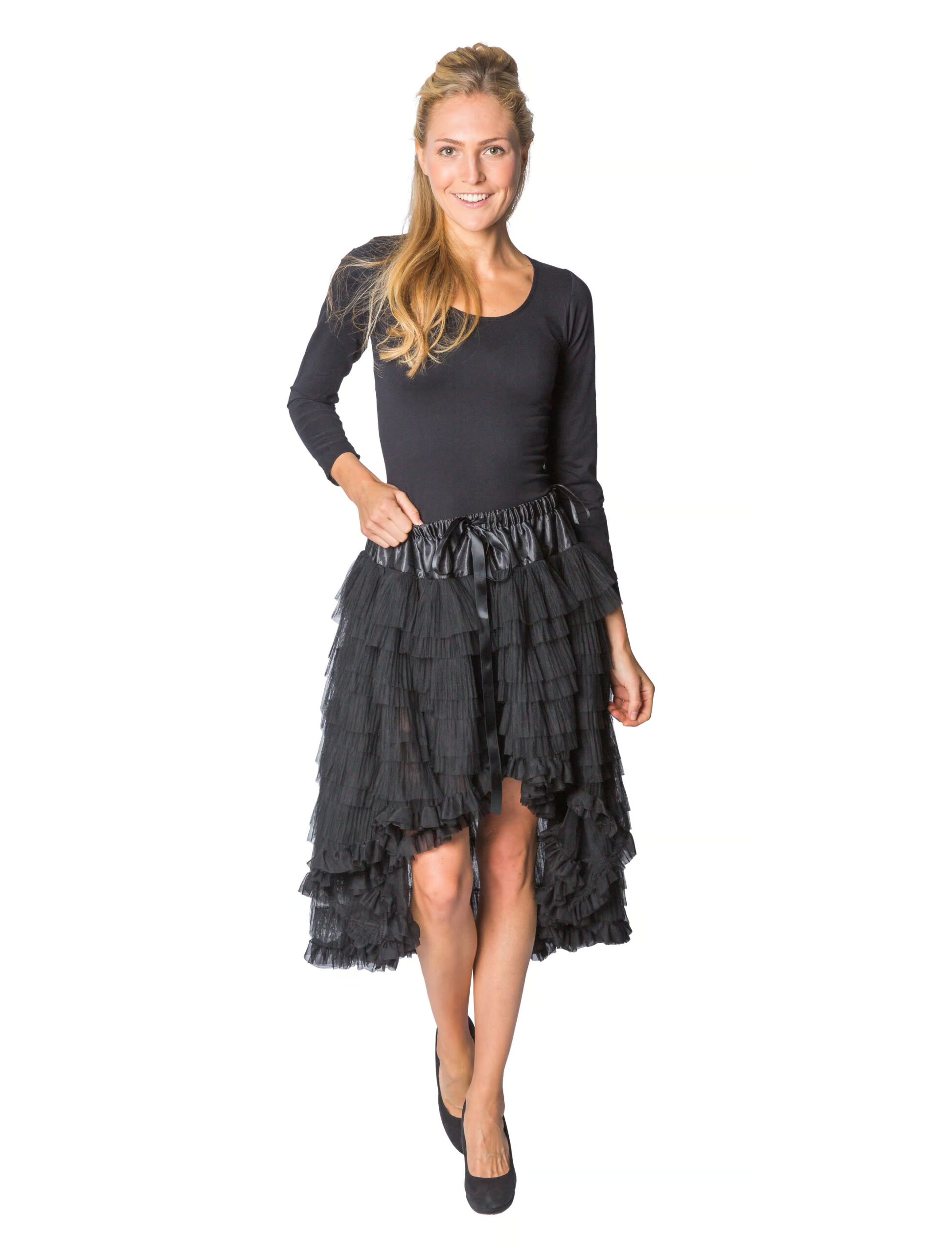 Toller Petticoat im 50er-Jahre-Stil! Der hübsche Faltenrock ist so schön, dass er viel zu schade wäre, um ihn nur drunter zu tragen. Er besteht aus einem schwarzen, leicht transparenten und mehrlagigen Stoff, der am Saumende mit hübschen Rüschen bestückt ist. Umwerfend sieht auch der asymmetrische Schnitt aus, der Deine Beine in das richtige Licht rückt!