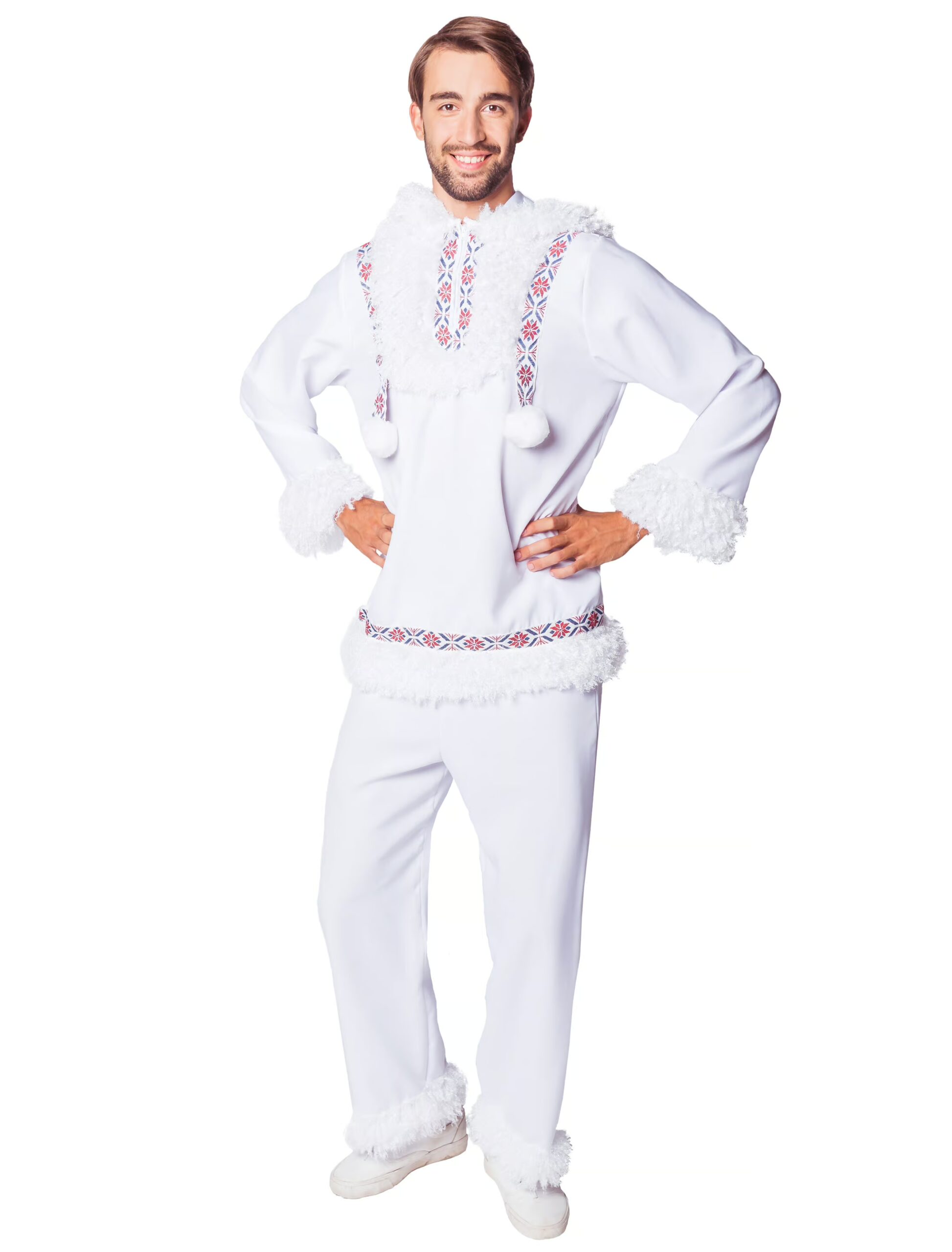 Dieses Kostüm ist ein Eisbrecher! Mit diesem kuscheligen Polar-Kostüm bist Du bestens vorbereitet für den eisigen Straßenkarneval. Das zweiteilige Herren Kostüm besteht aus einer weißen Hose und einem weißen, langärmligen Oberteil. Beide Kleidungsstücke sind mit flauschigem Kunstfell verziert. Das Oberteil ist rund um den Kragen und am Saum mit einer hübschen, bunten Borte verziert, die sich wunderbar vom hellen Kostüm abhebt. Die beiden weißen Bommel in der Front und die flauschige Kapuze machen das Polar Kostüm zu einem ganz besonderen Hingucker. Exklusiv Artikel.