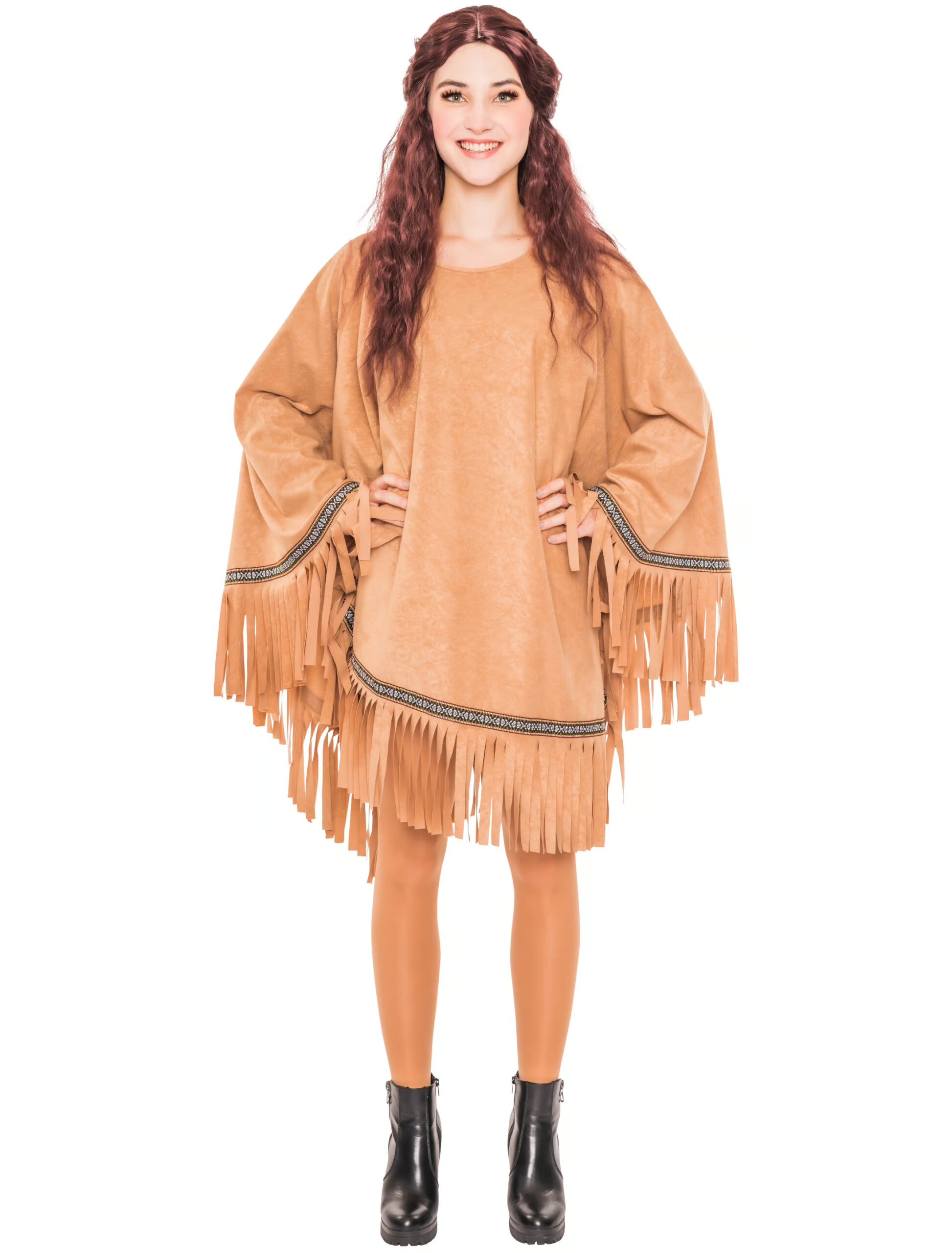 Mit diesem braunen Fransenponcho bist Du die schönste Indianerin auf jeder Kostümparty. Ein schönes Detail ist das bestickte Band über dem Rocksaum und an den Ärmeln. Der bequeme Poncho besteht aus pflegeleichtem Polyester und wird in Einheitsgröße S-2XL geliefert. Mit diesem Poncho brauchst Du kein Zubehör mehr, um eine klasse Figur abzugeben. Ein Paar schicke Stiefel und ein Stirnband und fertig ist der Poccahontas-Look.