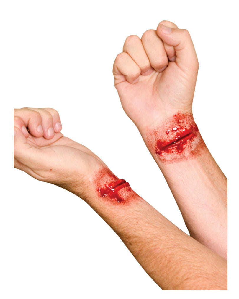 Pulsadern Massaker Latexwunde für Halloween Make-up und Theaterschminke 2-tlg. Latexapplikation als Spezial Make-up für Halloween und Zombie Walk Unzählige Horrorfilme und Thriller befassen sich mit dem Thema Selbstmord oder vorgetäuschtem Suizid. Bist du als Make-up Artist und Maskenbildner gefragt eine Wunde zu schminken, die aufgeschlitzte Pulsadern zeigen sollen? Dann ist unsere 2-teilige Pulsadern Massaker Latexapplikation genau das richtige. Die aufgeschlitzten Pulsadern sind aus Latex und werden mit Mastix Hautkleber auf die Unterarme montiert. Die Latexwunden dann noch mit Make-up und Filmblut zum realistisch aussehenden Spezial Make-up Effekt perfektionieren. Die Pulsader Massaker Latexwunde lässt sich nach Gebrauch einfach abziehen und kann immer wieder verwendet werden. Lieferumfang: 1x Pulsadern Massaker / Slashed Wrist Inhalt: 2 Latex Applikationen Farbe: Hautfarben/Rot Größe: Einheitsgröße Material: Latex