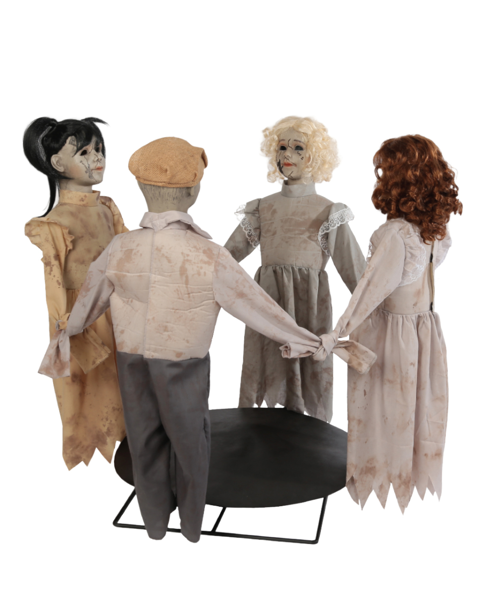 Ringel, Ringel, Reihe Animatronic mit Sound und Bewegung als Halloween Dekoration Furchteinflößende Kinderfiguren für Halloween und Mottopartys Die fiesen Kinderfiguren sorgen mit schaurigem Sound und gespenstischen Bewegungen sofort für echtes Geisterbahn-Feeling! Schnapp’ dir mit unserem Ringel, Ringel, Reihe Animatronic mit Sound und Bewegung als Halloween Dekoration einen Deko-Artikel der Extraklasse, die sich sowohl für professionelle Veranstalter, als auch private Halloween- und Horrorpartys perfekt eignet! Der Ringel, Ringel, Reihe Animatronic mit Sound und Bewegung als Halloween Dekoration weist eine Größe von ca. 85 x 93 cm auf und wird elektronisch betrieben. Die Kinderfiguren sind erschreckend realistisch verarbeitet und in altertümlich wirkende Kleider gesteckt. Die Halloween-Dekoration dreht sich, während zur bekannten Ringel, Ringel, Reihe-Melodie die Kinder den englischen Text sprechen und dabei kichern, dass es einem das Blut in den Adern gefrieren lässt. Dunkle Höhlen anstelle der Augen sorgen für zusätzlichen Grusel. Die Halloween-Figur lässt sich mittels Bewegungsmelder, beiliegender Fußmatte oder in Dauerschleife betreiben, ein Adapter für deutsche Steckdosen ist im Lieferumfang enthalten. Lieferumfang: 1 x Ringel, Ringel, Reihe Animatronic mit Sound und Bewegung als Halloween Dekoration Inhalt: 1 x Ringel, Ringel, Reihe Animatronic mit Sound, 1 x Fußmatte mit Aktivierungsfunktion 3 Funktionen: Dauerbetrieb, Bewegungsmelder oder Aktivierung durch Fußmatte Farbe: Beige / Grau Größe: 85 x 93 cm Material: Metall, Kunststoff, Polyester, Elektronik Adapter für deutschen Anschluss liegt bei Achtung: Es ist wichtig, dass die Halloween Animatronic freistehend, vor dem Zugriff durch Partygäste geschützt, aufgestellt wird. Die Halloween Animatronic besitzt eine sensible Elektronik, die kaputt gehen kann, wenn z.b verhindert wird, dass sich die Figur bewegen kann. Professionelle Halloween Animatronics sind grundsätzlich Dekorationsartikel zum Ansehen und nicht zum Anfassen! Die Halloween Animatronic ist eine Innendekoration und ist im Außenbereich nur zu verwenden, wenn diese eine trockene Überdachung hat!
