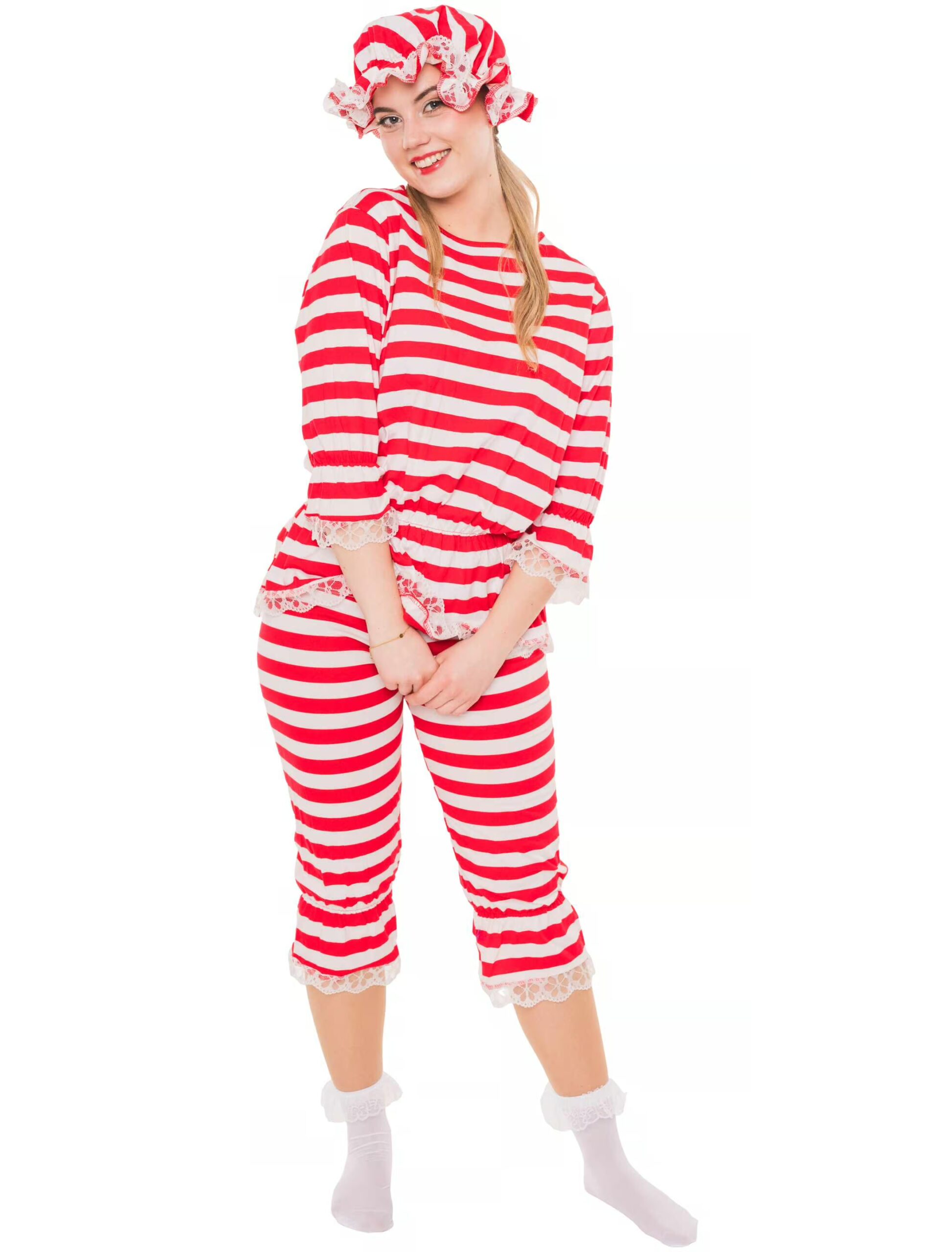 Ringelshirt und Hose mit Spitze 2-tlg. weiß/rot L/XL, ideal für Karneval & Fasching