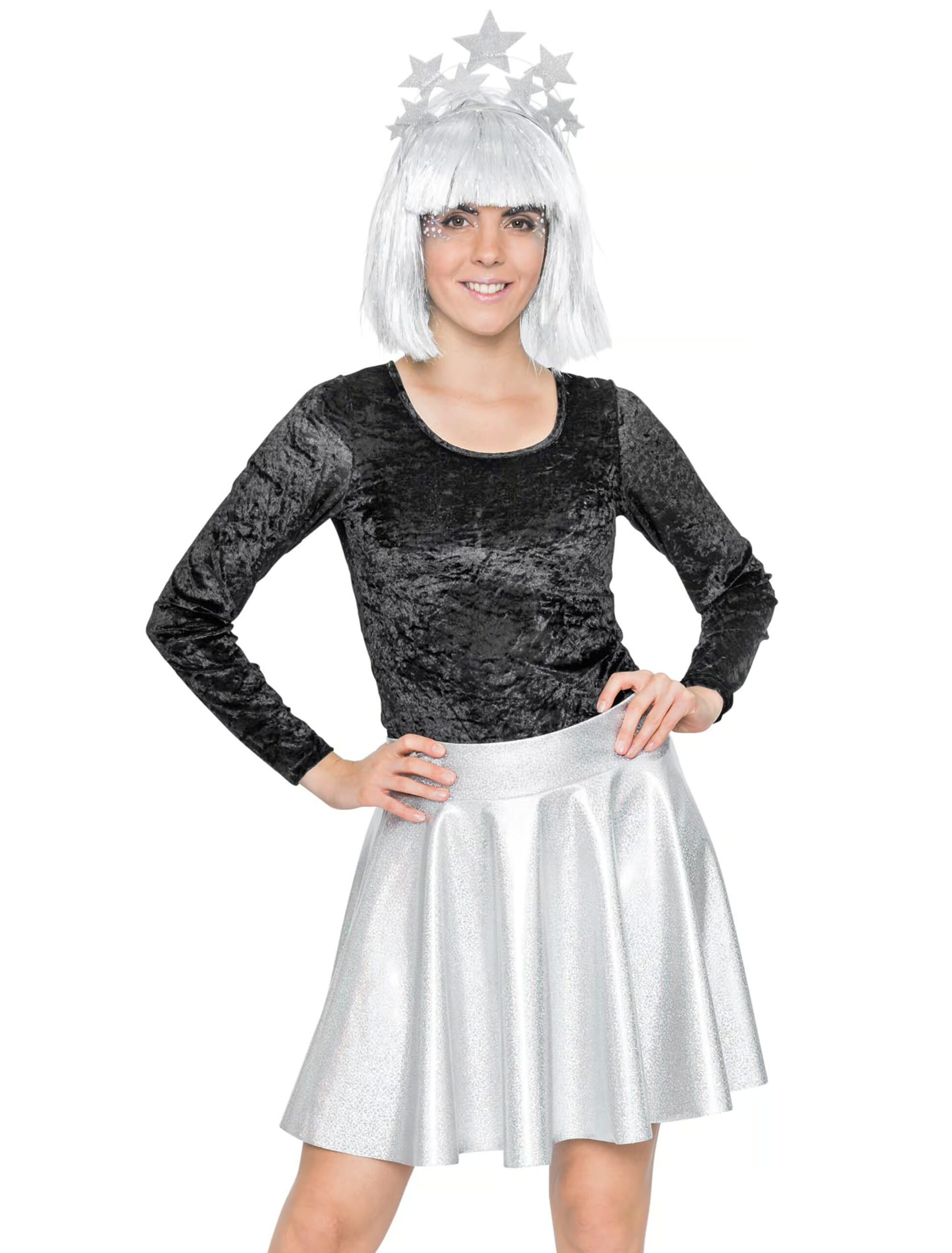 Der attraktive, silberne Rock Laser ist ein echter Hingucker und ein angenehmer Figurschmeichler. Er besteht aus Polyestermaterial, das nicht nur anschmiegsam ist, sondern auch eine glitzernde Struktur aufweist und besonders schön fällt. Dieser kurze, silberne Rock ist mit einem elastischen Bund ausgestattet. Er ist das perfekte Basic für aufregende KarnevalsKostüme und angesagte Disco- oder Space-Outfits. Auch auf Mottopartys bist Du in diesem Rock ein sehr gern gesehener Gast. Wenn Du ihn trägst, kannst Du Dich vor bewundernden Blicken kaum retten und die närrische Männerwelt liegt Dir zu Füßen.