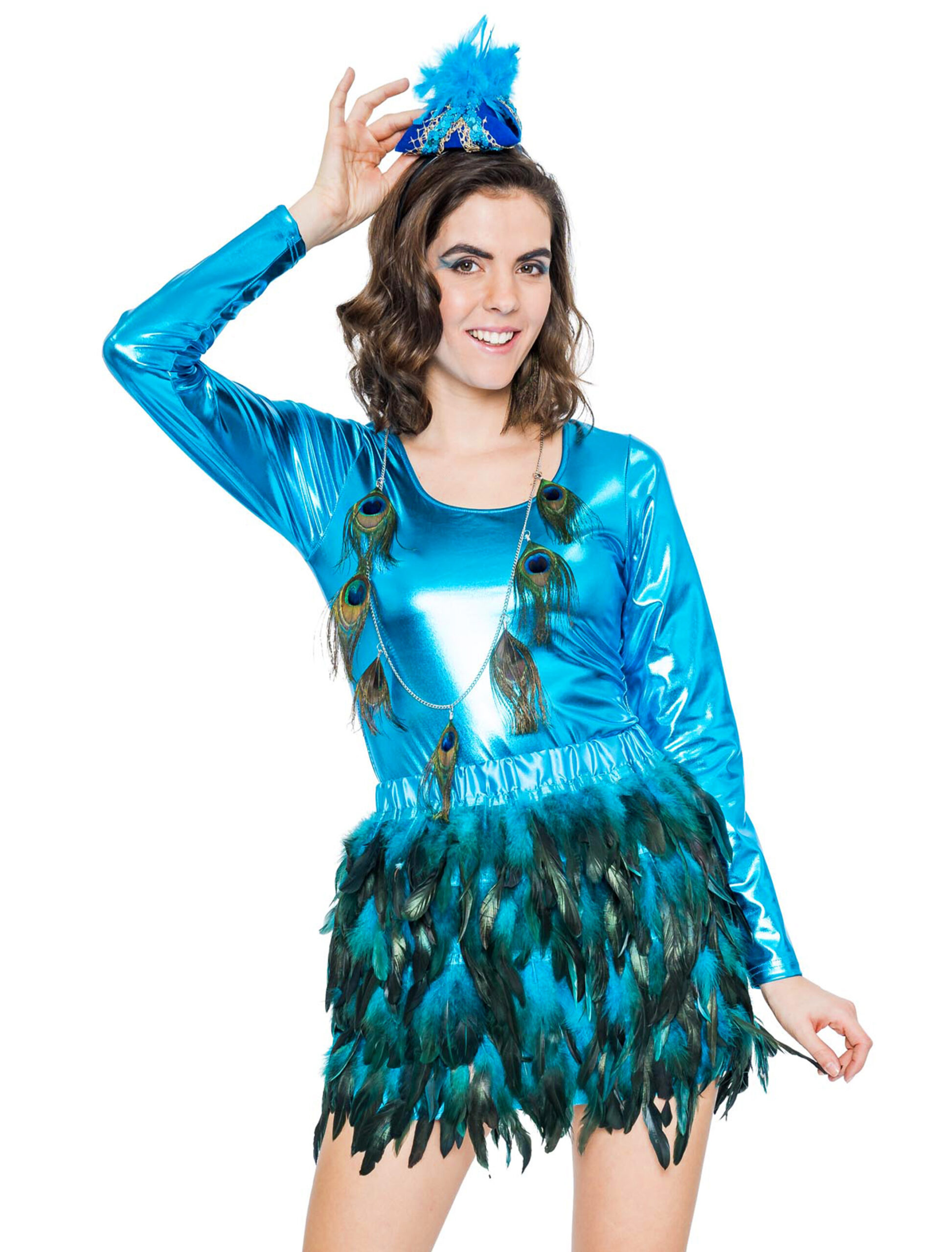 Mit diesem richtig auffälligen Rock in den Größen S/M und L/XL aus türkisfarbenen Federn bist Du der Blickfang beim Karneval und auf jeder Faschingsparty. Verkleide Dich als Paradiesvogel oder als Pfau, die Aufmerksamkeit der anderen ist Dir sicher. Dank dem Gummiband sitzt der Rock sehr bequem. Idealer Rock zum Thema Pfau.