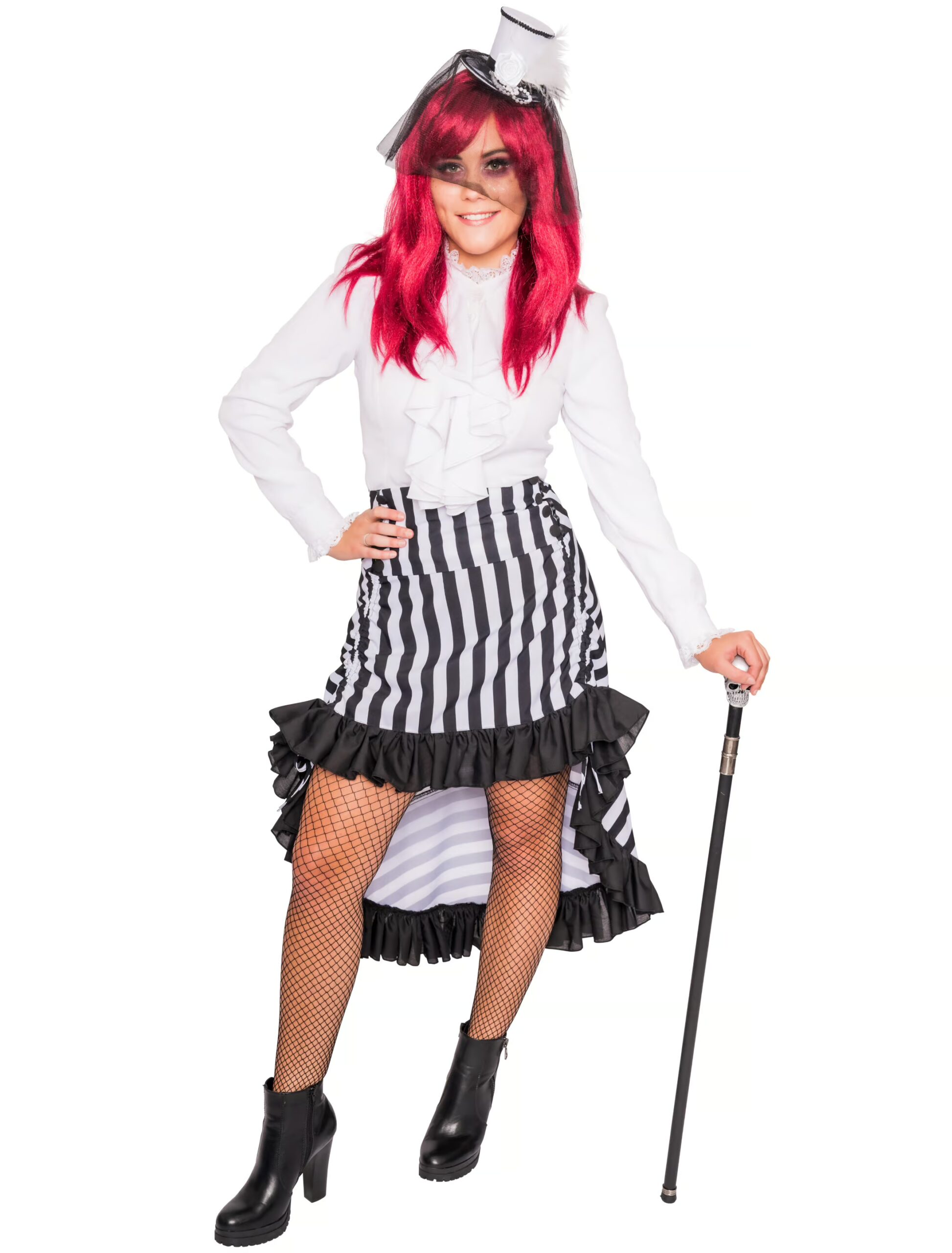 Gothik-Look oder viktorianisch angehauchter Steampunk, ganz gleich, für welches Outfit Du Dich für die nächste Kostümparty entscheidest, dieser schwarz-weiß gestreifte Rock im vorne-kurz-hinten-lang-Schnitt ist auf jeden Fall dabei. Aufwendige Details wie Schnürung zum Raffen in der Front, dekorative Seitenknöpfe und der breite Volant am Rocksaum machen diesen ohnehin extravaganten Rock noch auffälliger. Zusammen mit süßer Volantbluse, verziertem Zylinder, roter Perücke und witzigem Totenkopf Gehstock ist Dein unvergesslicher Auftritt garantiert.