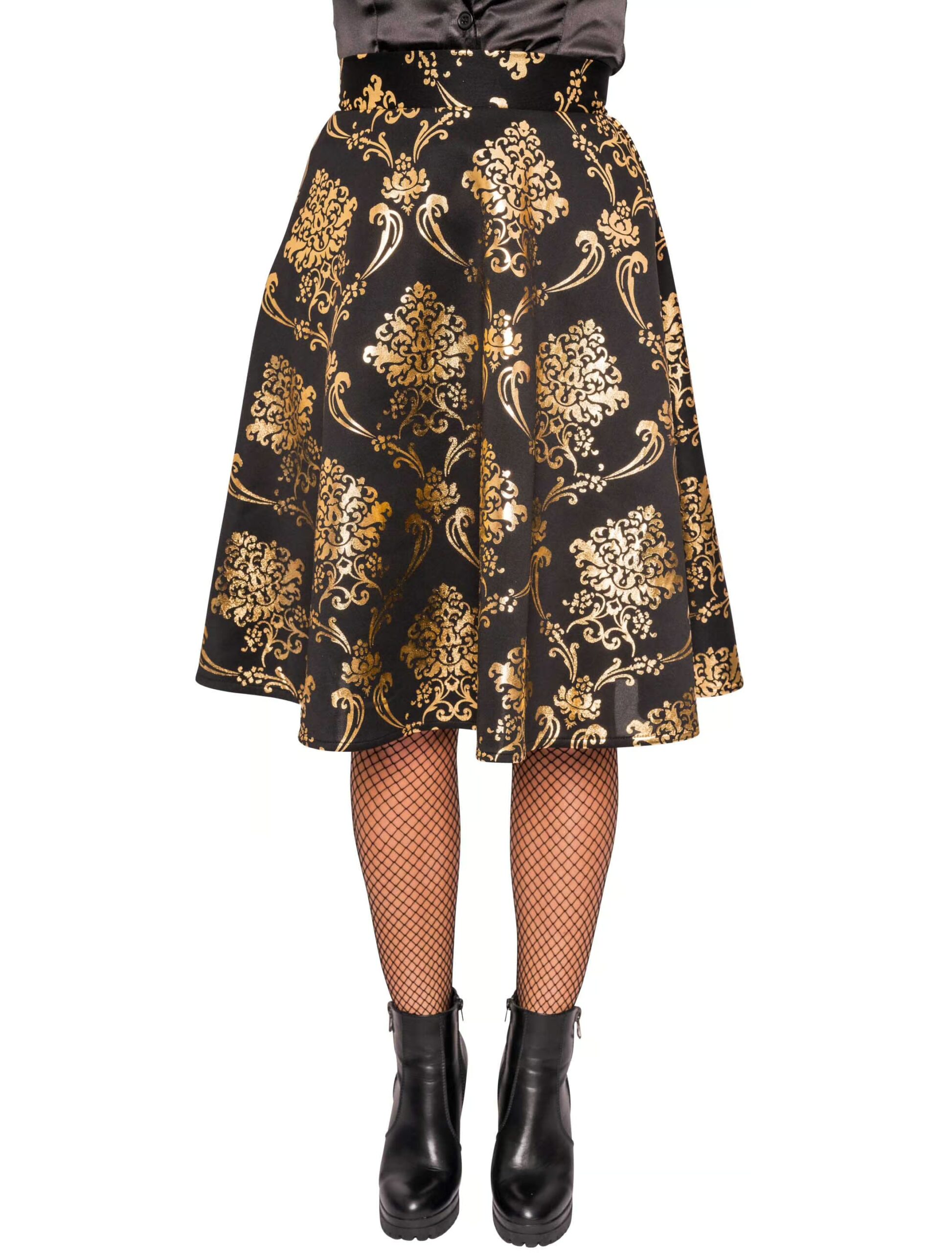 Dieser schwarze mit goldenen Verzierungen bedruckte Steampunk Rock macht aufgrund der hoch geschnittenen Taille ohne Bündchen eine umwerfende Figur. Dieser außergewöhnliche Rock eignet sich für alle Ereignisse, anlässlich derer Du gerne auffallen darfst oder willst. Der luftig-leichte Streampunk Rock aus Polyester sieht einfach unwiderstehlich in Kombination mit unserer schwarzen, Spitzen verzierten Bluse und Netzstrümpfen aus. Mit diesem viktorianisch angehauchten Outfit wird Dich niemand so schnell wieder vergessen.