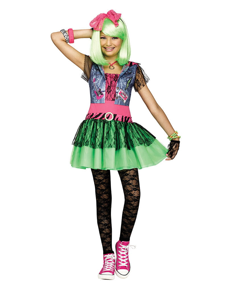 Rockiges 80s Kinderkostüm für Fasching Rocker Kostümierung im Style der 80er Mit unserem rockigen 80s Kinderkostüm für Fasching kannst du schnell und unkompliziert einen echten Rockstar verkörpern! Gesellschaftliche Konventionen und Normen zu brechen passt zu nihcts besser als zu Fasching – und zum Rock. Eine coole Verkleidung für Fasching und Mottopartys! Das rockige 80s Kinderkostüm für Fasching besteht aus mehreren Teilen. Das Kleid mit schrillem pinken Oberteil und giftgrünem Rock weist eine stilisierte, passend gestaltete Jeansjacke auf. Netzapplikationen an Schultern, Dekolleté und Rock schmücken das Rockstar Karnevalskostüm zusätzlich. Die pinke Schleife wird mittels eines Haarreifs einfach ins Haar gesteckt. Zwei fingerlose Netzhandschuhe komplettieren das Bild eines Rockstars. Lieferumfang: 1x Rockiges 80s Kinderkostüm für Fasching Inhalt: Kleid, Haarreif, 2 Handschuhe Farbe: grün/pink/schwarz/blau Material: 100% Polyester, Kunststoff Perücke, Strumpfhose, Schuhe und Armbänder nicht enthalten! Größe M ca. 8-10 Jahre L ca. 12-14 Jahre XL ca. 14-16 Jahre Brustumfang ca. 69-76 cm ca. 76-81 cm ca. 81 cm -86 cm Taillenumfang ca. 58-63 cm ca. 60-66 cm ca. 65 – 70 cm Körpergröße ca. 124-137 cm ca. 139-152 cm ca. 145 cm – 162 cm Achtung: Der Artikel ist ein Kostüm und kein Spielzeug. Nicht für Kinder unter 3 Jahren geeignet. Kann Kleinteile enthalten, die verschluckt werden können – Erstickungsgefahr. Von Feuer und offenen Flammen fernhalten.