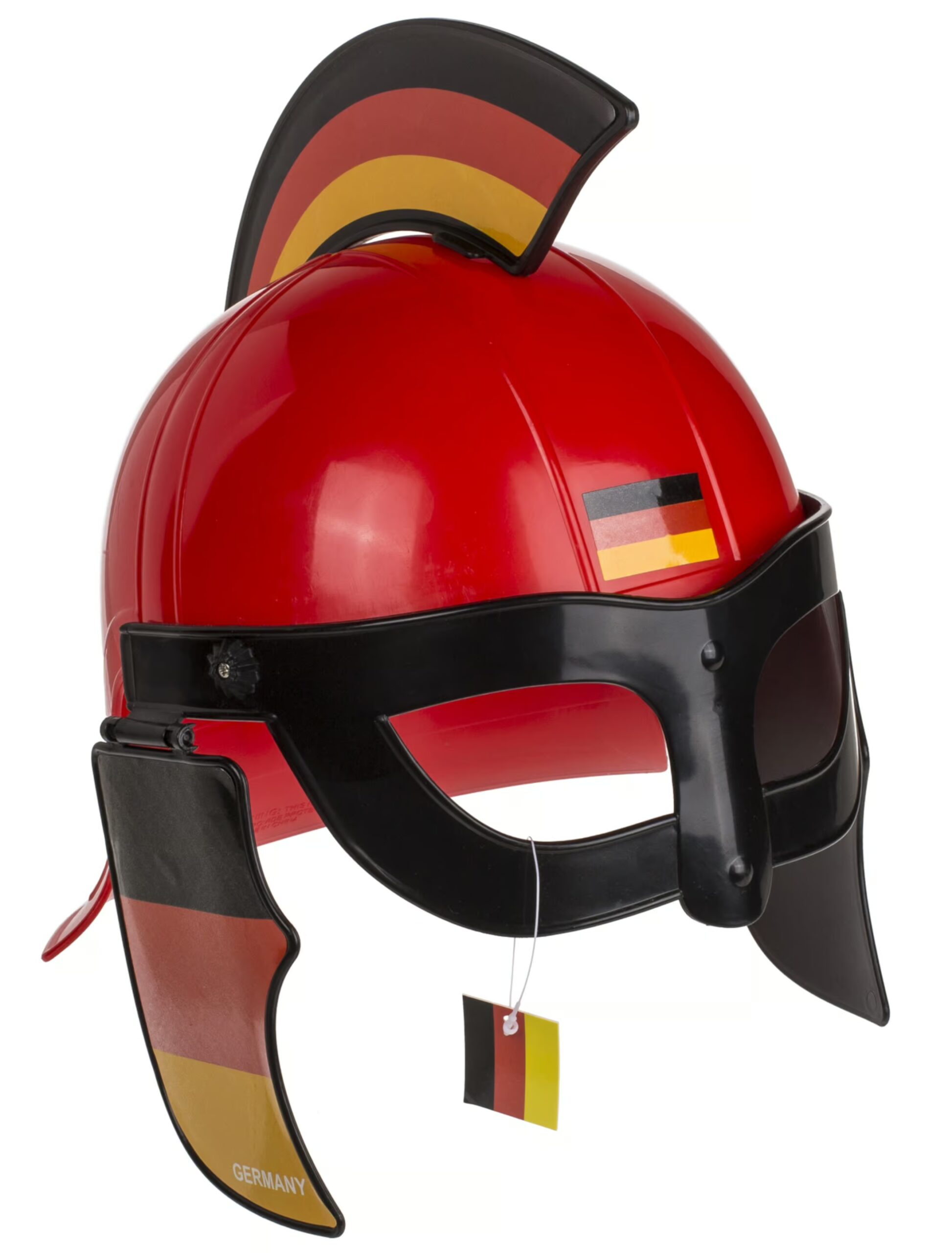 Dieser leichte Römerhelm in den Farben der Deutschlandflagge aus Kunststoff, mit dem abnehmbaren Kamm und dem beweglichen Visier ist das perfekte Accessoire für fantastische Kostümierungen im antiken, römischen Stil oder diversen Sport-Events. Mit diesem Helm und dem entsprechenden Kostüm aus unserem Shop verwandelst Du Dich in einen römischen Soldaten oder auch einen siegreichen, römischen Feldherren, dem die Frauenwelt auf Mottopartys und Kostümfesten zujubelt.