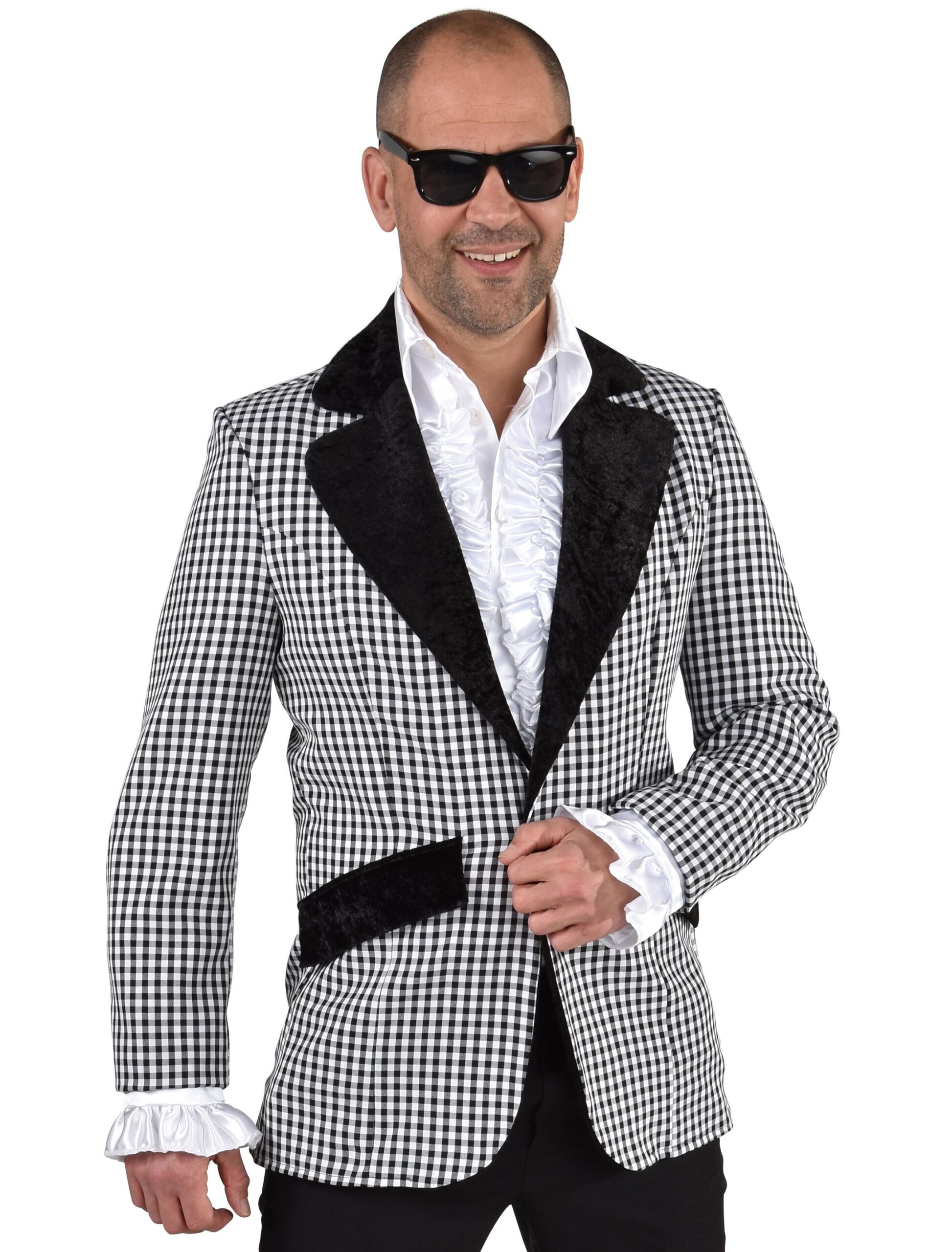 Cool und stilsicher – das bist Du mit diesem extravaganten Sakko garantiert! Das Kleidungsstück für Herren besteht aus einem schwarz-weiß-karierten Stoff, der am Revers und an den seitlichen Taschenansätzen mit schwarzem Pannesamt-Stoff verziert ist. In der Front lässt sich das klassisch geschnittene Sakko mit einem Knopf schließen. Dazu passen weitere ausgefallene Kleidungsstücke und Accessoires, zum Beispiel ein Rüschenhemd, eine Sonnenbrille, eine Perücke oder ein Mikrofon. Egal für welche Accessoires Du Dich entscheidest, mit dem Sakko legst Du garantiert einen tollen Auftritt hin!