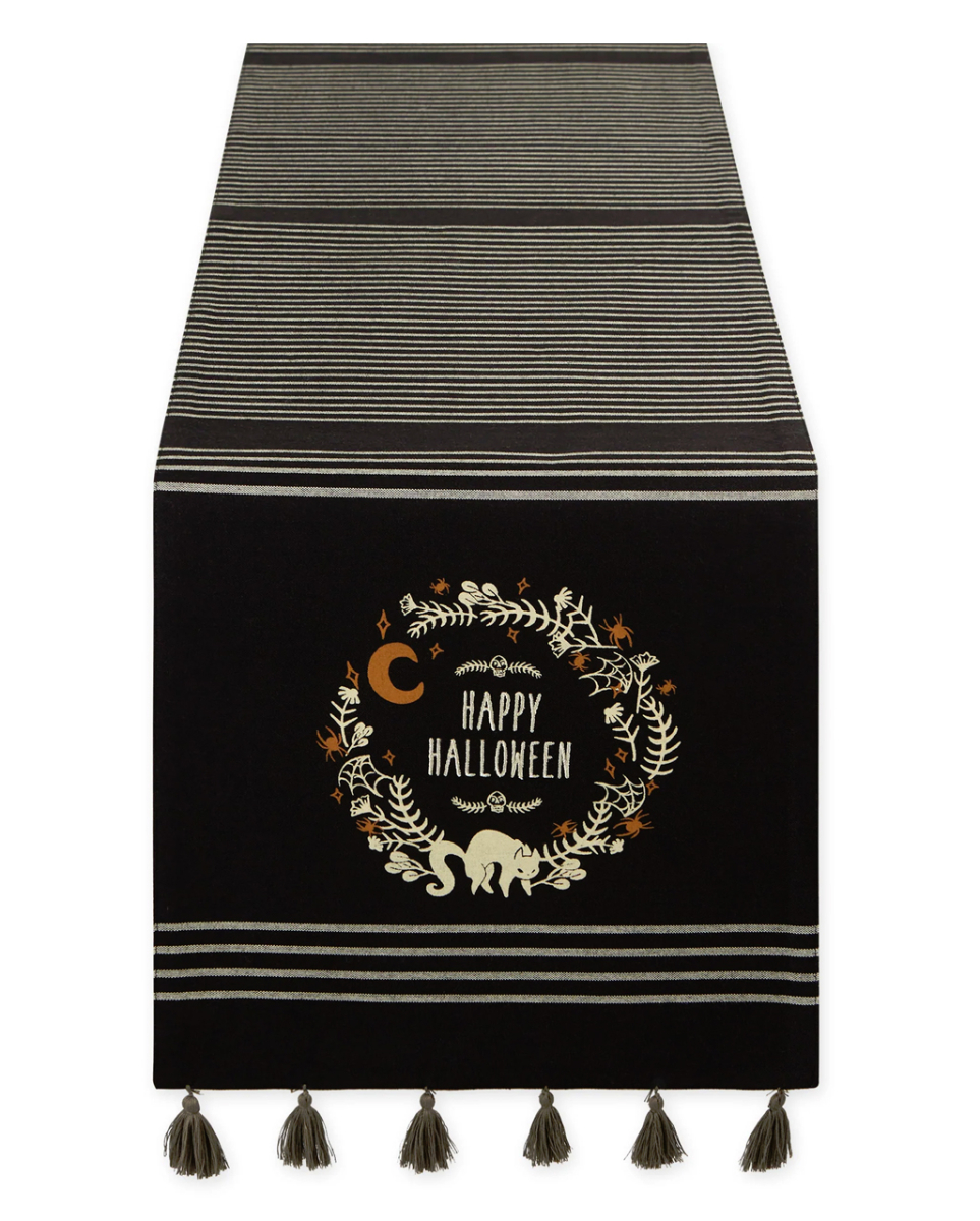 Ängstliche Katze Happy Halloween Tischläufer 183cm Schmale Tischdecke mit spooky Kätzchen Unser ängstliche Katze Happy Halloween Tischläufer Tischdecke zeigt einen Kranz aus Fischgräten mit der Aufschrift ",Happy Halloween", und einem buckeligen Kätzchen. Der Hit für jedes Halloween Buffet! Unser spooky Tischläufer mit Katze misst stolze 183 cm in der Länge und besteht aus 100% hochwertiger Baumwolle. Die Tischdecke ist wiederverwendbar und ein süßer Blickfang für Katzen- und Halloween Fans. Lieferumfang: 1 x Ängstliche Katze Happy Halloween Tischläufer 183cm Farbe: Schwarz, Beige, Orange Größe: ca. 183 cm Material: 100% Baumwolle Läufer mit HAPPY HALLOWEEN Stickerei Katzen Halloween Tischdekoration Gruselige Partydeko fürs Halloween Buffet Wiederverwendbarer Läufer mit Halloween Motiv Absoluter Hingucker am Halloween Buffet